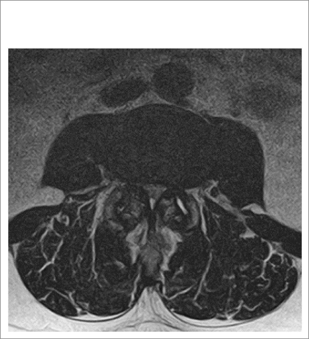 Рис. 1. Аксиальная проекция на уровне межпозвоночного диска LIII–LIV, сужение центрального спиномозгового канала; сужение латеральных карманов, больше слева.
