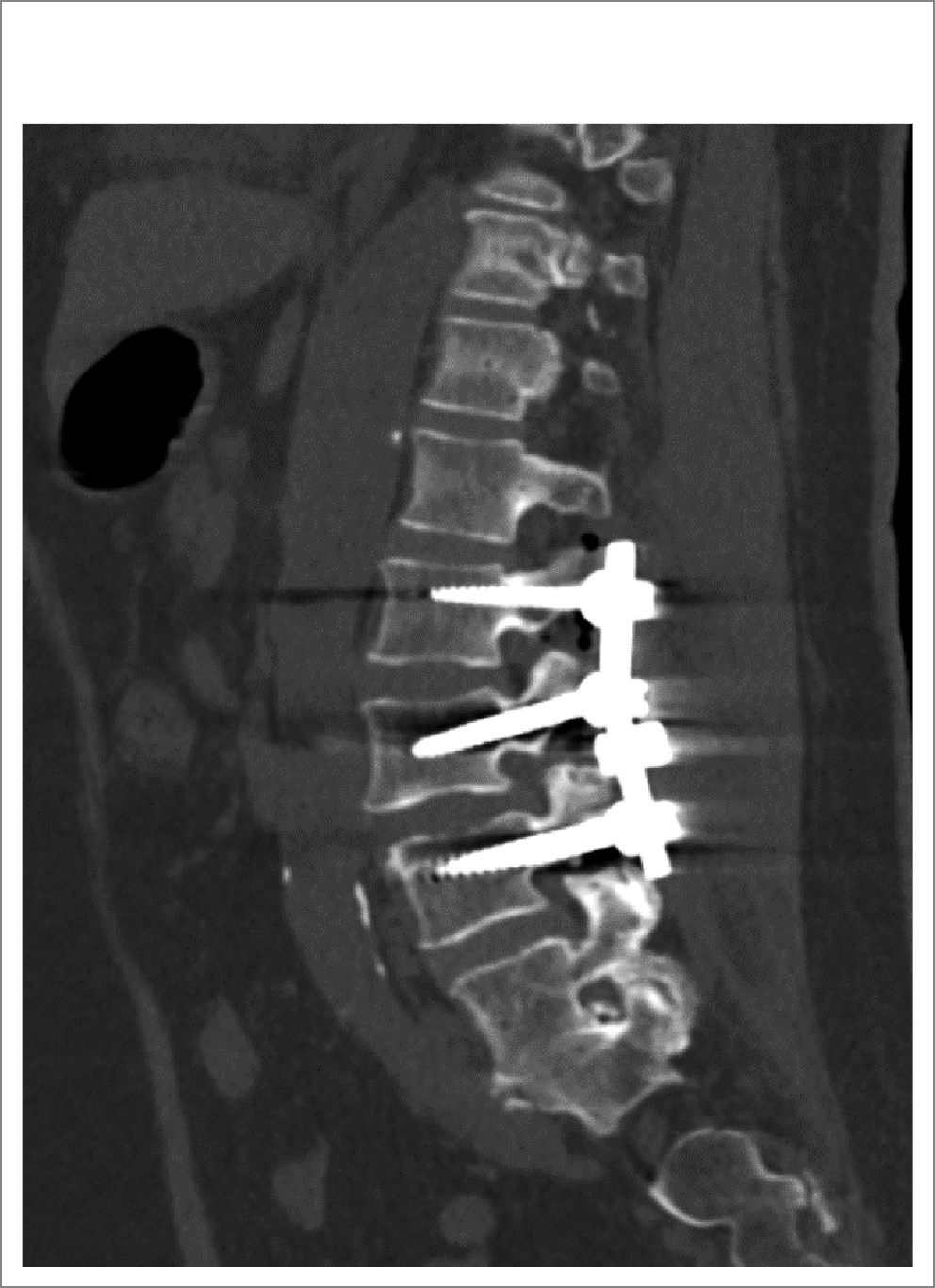 Рис. 2. Сагиттальная проекция, транспедикулярная винтовая фиксация LII–LIII–LIV.