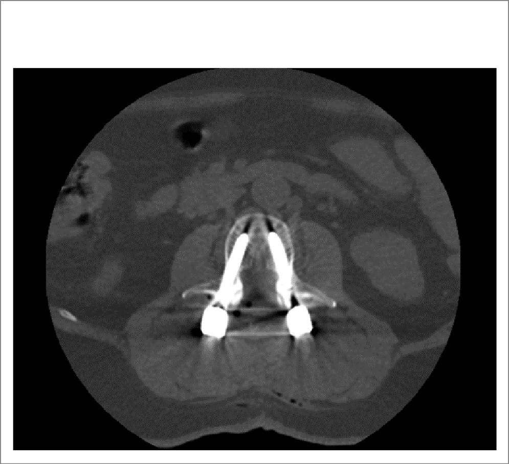 Рис. 3. Аксиальная проекция на уровне LIII позвонка, ламинэктомия и транспедикулярная винтовая фиксация.
