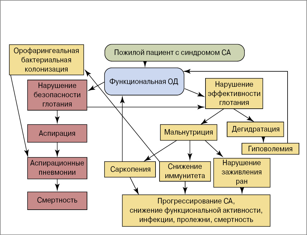 Недостаточность питания, в свою очередь, за счет вклада в прогрессирование саркопении усиливает имеющиеся нарушения глотания, способствует прогрессированию СА и снижению мобильности, а также путем развития иммунных нарушений повышает риск инфекционных осложнений, что в совокупности значительно повышает риск повторных госпитализаций и смертности для таких пациентов.