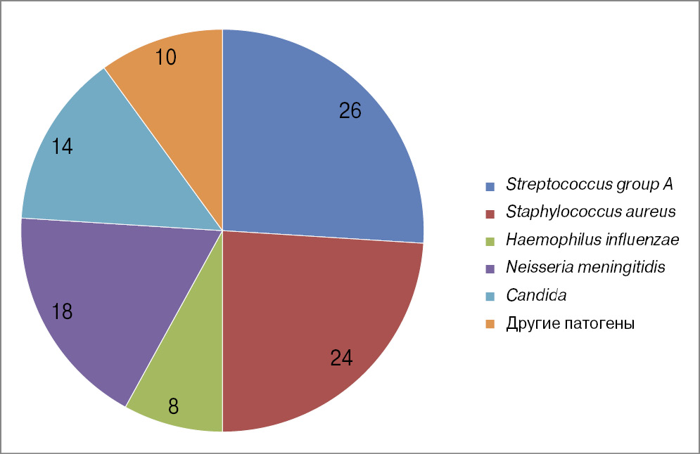 Наиболее распространенным бактериальным агентом, вызывающим тонзиллофарингит, является β-гемолитический стрептококк группы А (БГСА), который вызывает от 5 до 36% случаев острого воспаления глотки [4]. Кроме того, в патогенезе острых воспалительных заболеваний глотки участвуют такие бактериальные агенты, как стрептококки группы B и C, Chlamydia pneumoniae, Mycoplasma pneumoniae, Haemophilus influenzae, Candida, Neisseria meningitidis, Neisseria gonorrhoeae.