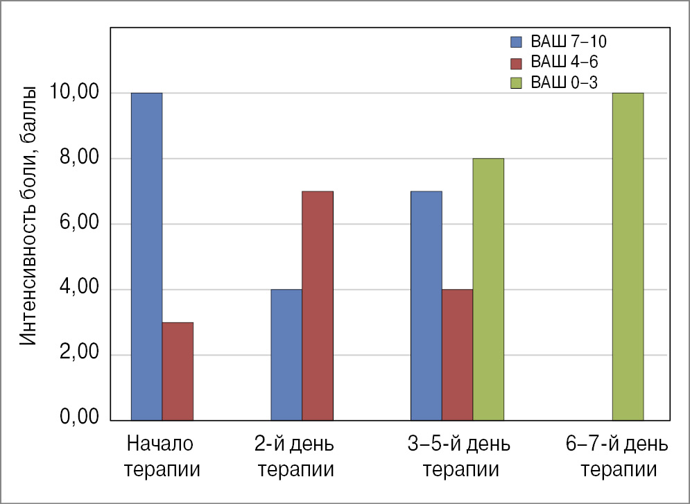 Эффективность препарата в группе наблюдения оценивали по 10-балльной визуальной аналоговой шкале боли (ВАШ), заполняемой пациентами ежедневно, а также при осмотре на 5-й день лечения. ВАШ представляла собой отрезок длиной 10 см. Его начало соответствовало отсутствию болевого ощущения – «боли нет», а конечная точка отражала мучительную нестерпимую боль – «невыносимая боль». Пациенту предлагалось сделать на ней отметку, соответствующую интенсивности испытываемых им в данный момент болей. Расстояние между началом отрезка («боли нет») и сделанной отметкой, описывающей боль, измеряли в сантиметрах и округляли до целого (рис. 2).