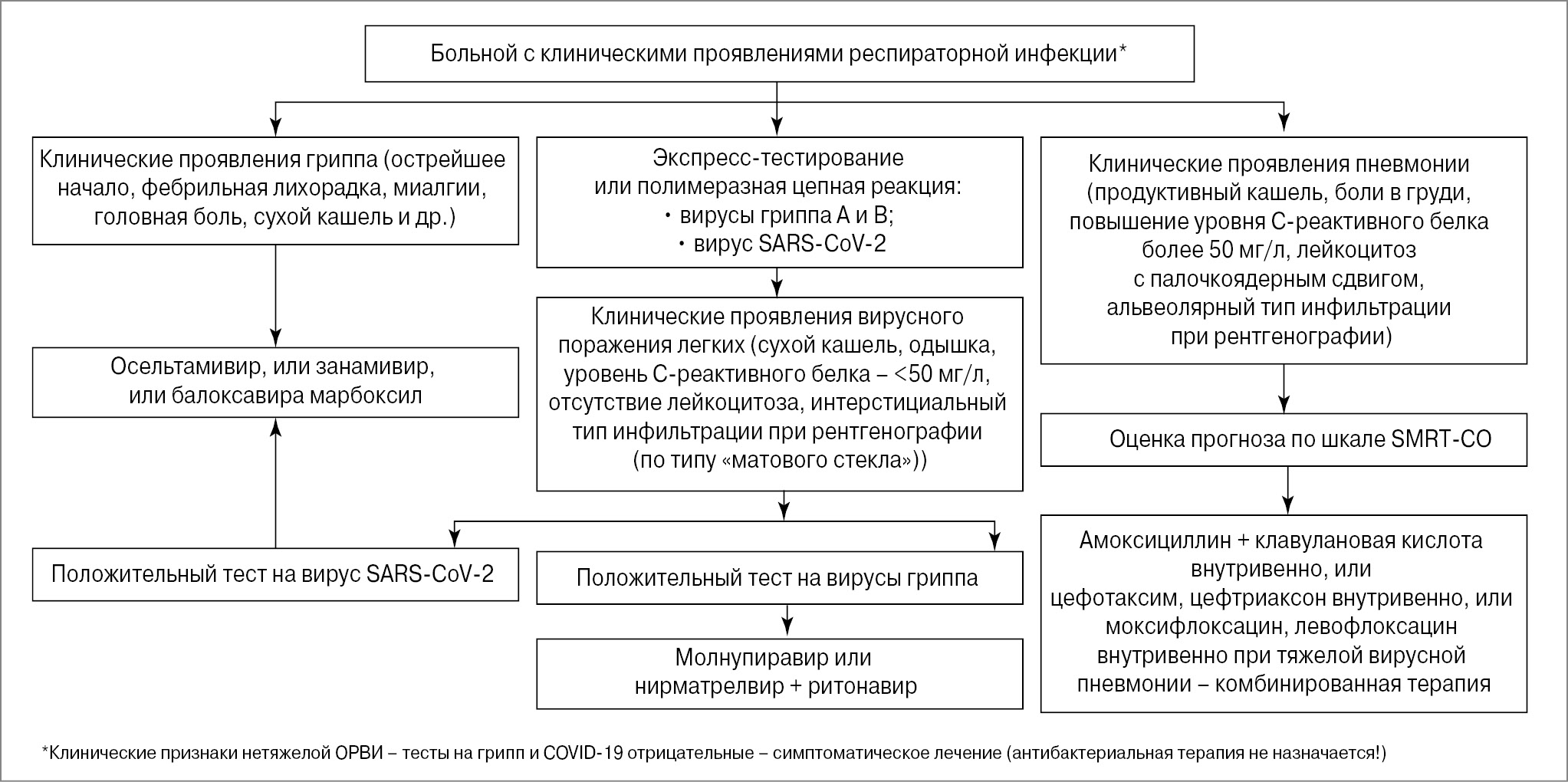 В качестве примера, уточняющего алгоритм действий врача при острой респираторной патологии (рис. 1), приведем клиническую ситуацию пациента. Мужчина 64 лет заболел остро после уборки снега на даче, в вечерние часы почувствовал выраженное общее недомогание («разбитость»), озноб. Температура тела – 38,7ºС, миалгия (тянущие боли в нижних конечностях). На утро появились сухой надсадный кашель, першение в области трахеи. Аускультативно выслушиваются единичные сухие хрипы на выдохе в проекции верхних долей обоих легких. На фоне форсированного выдоха – сухой кашель. Степень насыщения гемоглобина кислородом – 97%. В анамнезе: артериальная гипертензия, постоянная форма фибрилляции предсердий, сахарный диабет (СД) 2-го типа.