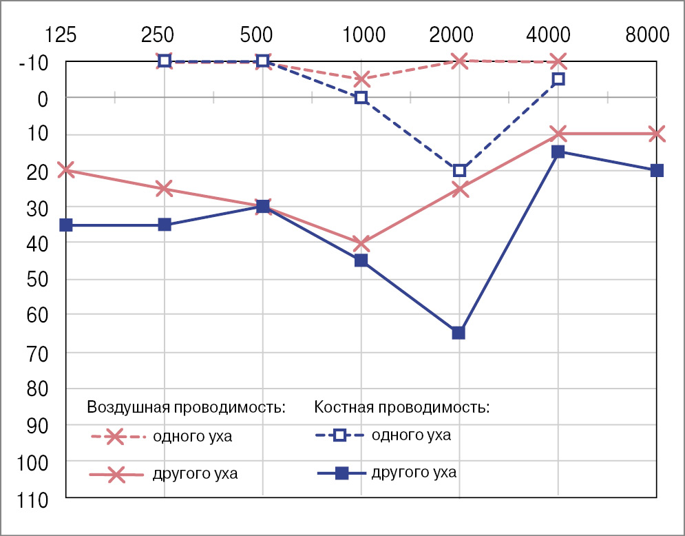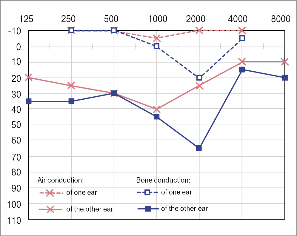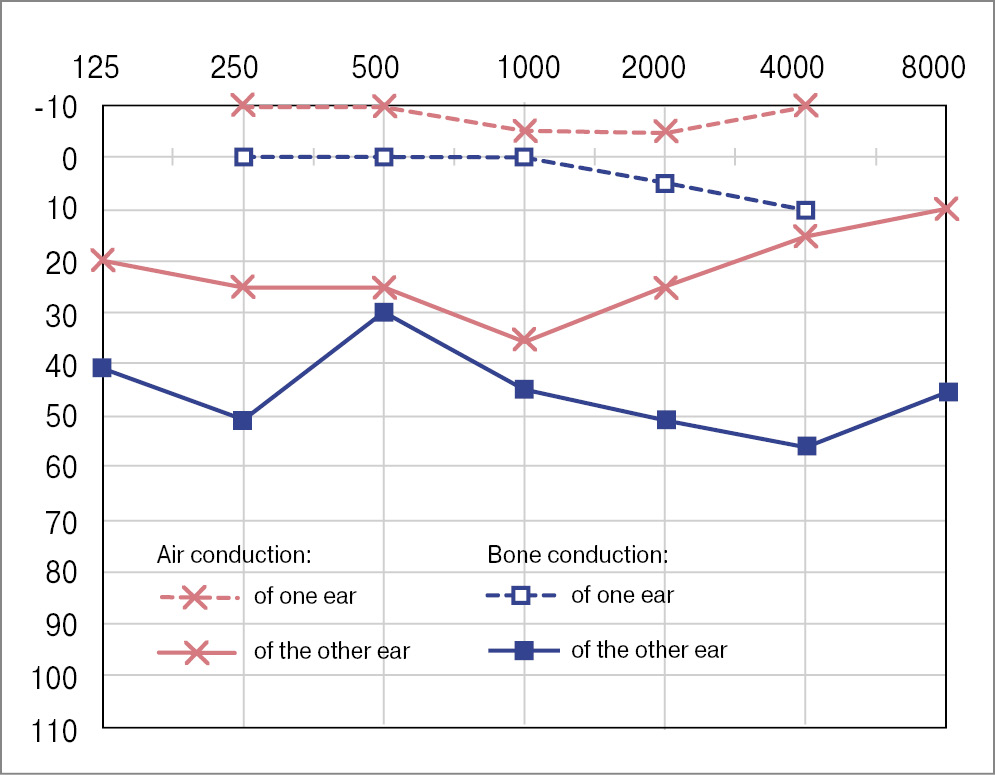 In the postoperative period, the patient received antineuritic and antibacterial therapy and acetazo-lamide and remained on bed rest with an elevated head position for two days. There were no events of vestibulopathy or perilymphorrhea in the postoperative period. The follow-up tonal threshold au-diometry showed no hearing deterioration on day 13 after the surgery (Fig. 9). Note the absence of a Carhart notch on the audiogram after the surgery.