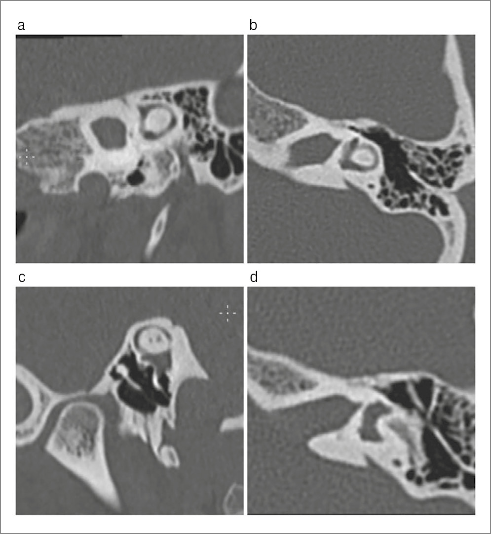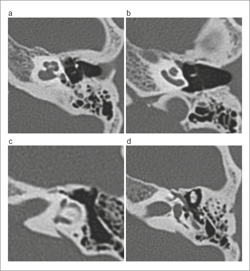 Fig. 2. MSCT scans of the left TB showed the normal structures of the vestibule: a – normal dimensions and absence of bone wall defects in the middle and apical turns of the cochlea; b – normal dimensions and absence of wall defects in the perilymphatic duct and the basal turn of the cochlea; c – normal dimensions of the vestibular aqueduct; d – normal dimensions and absence of bone capsule defects in the vestibule.