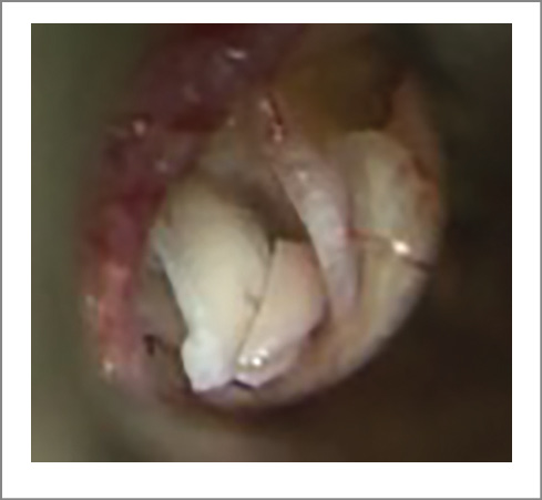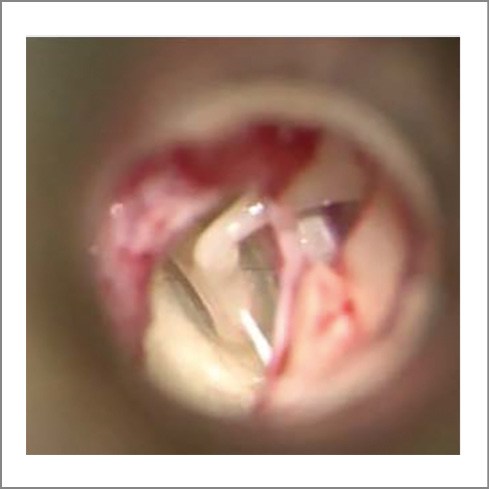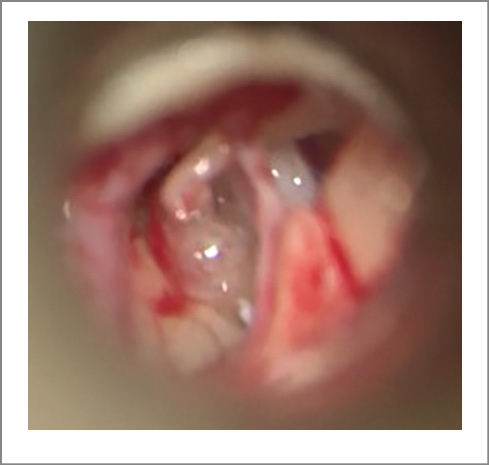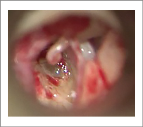 Fig. 7. Intraoperative otomicroscopy: left TC. After the perforation of the FPS, abundant perilymphoria was obtained (gusher syn-drome).