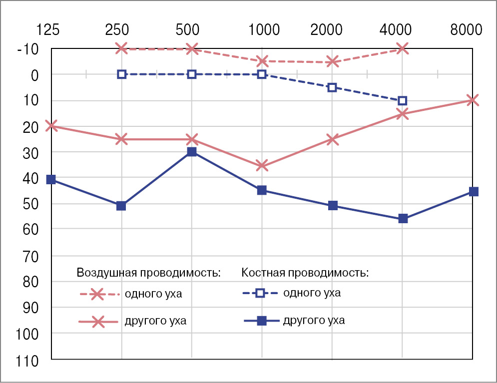 In March 2023, patient L., 24 years old, presented at the St. Petersburg Research Institute of ENT with hearing loss in both ears, more on the left, and periodic mixed tinnitus. She had these symptoms for 2 years. According to the patient, she had no previous history of chronic or acute ear diseases; her family history is unremarkable. From 2010 to 2016, she was followed up by an epileptologist for an epilepsy episode; in 2016, she was withdrawn from the follow-up. Somatically, she had an arach-noid retrocerebellar cyst and a congenital anomaly of the urinary system, left kidney duplication. Other findings were unremarkable. The otoscopic pattern was normal. When conducting acoustic impedance measurement, the type A tympanogram on both sides was recorded; the stapedial reflex-es on both sides were absent. Tonal audiometry corresponded to a grade 2 mixed hearing loss on the left, with the Carhart notch at 2000 Hz and grade 1 conductive hearing loss on the right (Fig. 1). When examined with a 128 Hz tuning fork, the lateralization of sound in the Weber test spread to the left ear, the Rinne’s, Federicci’s and Gellé tests were negative on both sides. CT (Fig. 2, 3) and virtual CT endoscopy of the ME (Fig. 4) showed no changes in the ME and IE. The configuration of the semicircular canals, the vestibular aqueduct, and the perilymphatic duct were unremarkable. TB CT showed no demineralization of the labyrinth bone capsule, gross deformations of the AO chain, or abnormalities in the structure of the ME and IE.