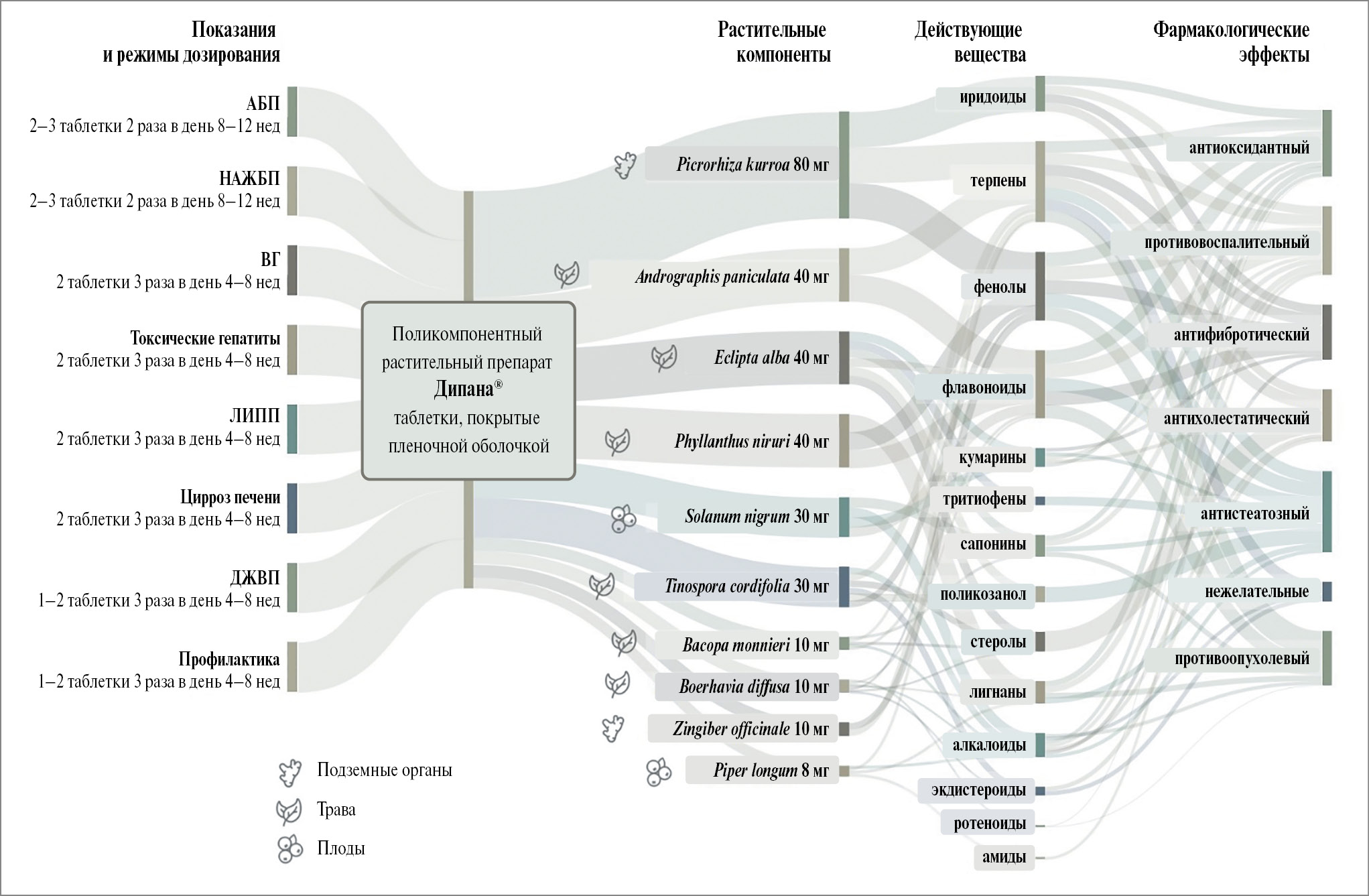 Препарат Дипана® содержит экстракты 10 растений различных семейств, фитохимический состав которых представлен терпенами, флавоноидами, полифенолами, сапонинами, алкалоидами различных классов и многими другими группами биологически активных веществ. Для отдельных компонентов каждого растения, а также суммарных извлечений из них на клеточных и животных моделях метаболически ассоциированных, алкогольных и иных токсических поражений печени показаны антиоксидантный, противовоспалительный, антистеатозный, антифибротический, антихолестатический, а также дополнительные хемопревентивный и противоопухолевый эффекты. Состав позволяет ожидать от препарата Дипана® высокой клинической эффективности при применении для лечения АБП, НАЖБП, ЛИПП и иных токсических поражений печени, хронических ВГ, а также ДЖВП. Для дальнейшего изучения эффективности и безопасности препарата Дипана® требуется проведение крупных рандомизированных КИ.