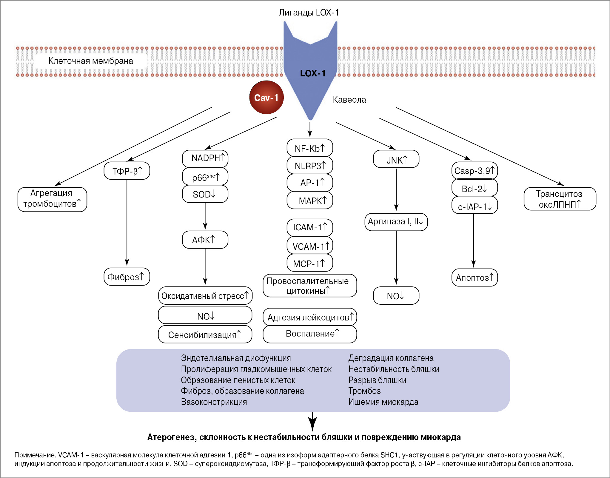 Экспрессия LOX-1 индуцируется фактором некроза опухоли α (ФНО-α), интерлейкином (ИЛ)-1, 6, интерфероном γ, ангиотензином II, эндотелином-1, С-реактивным белком (СРБ), липополисахаридами, модифицированными ЛП, высокой концентрацией глюкозы, гомоцистеином и свободными радикалами [9]. LOX-1 принимает участие в трансцитозе оксЛПНП, приводящем к трансформации макрофагов в пенистые клетки и пролиферации СГМК [9].