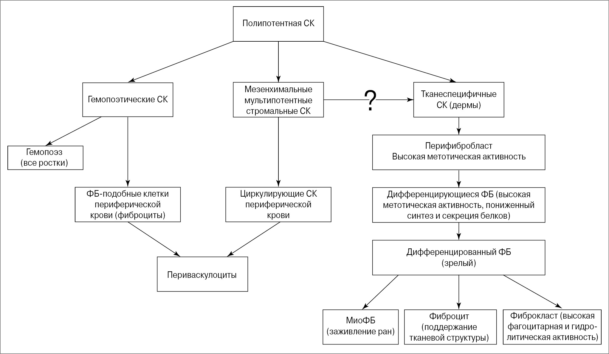 Исходными клетками для развития ФБ являются мультипотентные мезенхимные стромальные клетки (или стволовые стромальные клетки) [22, 27, 28] костномозгового происхождения. Это самоподдерживающаяся популяция клеток, способных к дивергентной дифференцировке, в том числе с образованием ФБ. Эти клетки имеют общего предшественника и различаются по степени дифференцировки, специализации, а также морфологическим и функциональным характеристикам. Наименее дифференцированными, морфологически распознаваемыми клетками рыхлой соединительной ткани являются камбиальные, или периваскулярные, клетки (реже используют термин «стволовые стромальные клетки периваскулярной локализации»). Они претерпевают несколько циклов деления, пополняя клеточную совокупность новыми элементами, часть из которых под влиянием факторов микроокружения дифференцируется в зрелые функционирующие ФБ, которые рассматривают как медленнорастущие клетки с незначительной транскрипционной активностью [13]. Заключают цитогенетический ряд (дифферон) терминально дифференцированные клетки (фиброциты), а также стареющие и гибнущие клеточные элементы [7, 29–31].