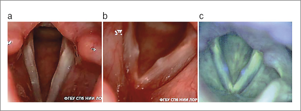 Рис. 3. Девочка А., 15 лет: а – двусторонние бороздки голосовых складок; b – двусторонние кисты голосовых складок заполняют бороздки (видеоэндостробоскопия); c – двусторонние кисты голосовых складок заполняют бороздки (аутофлюоресцентная эндоскопия).