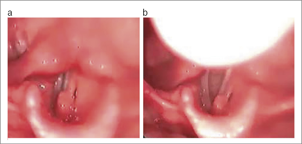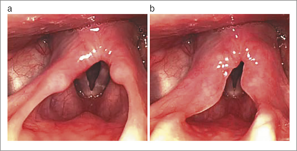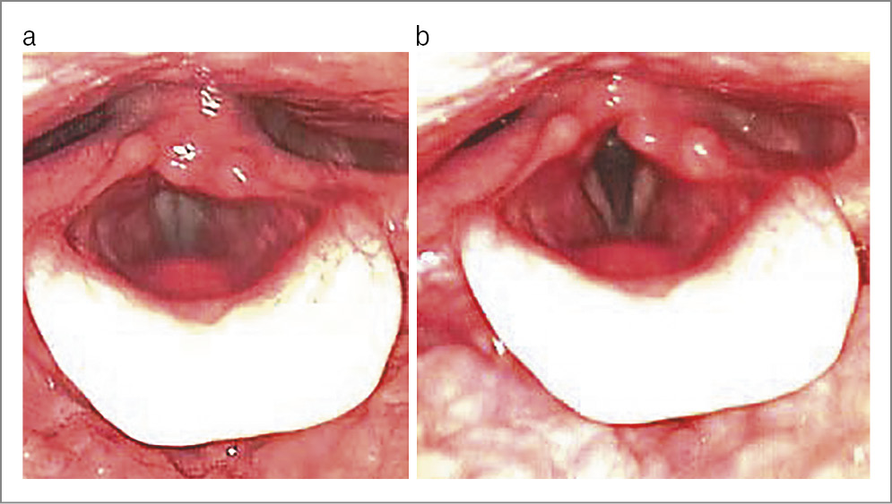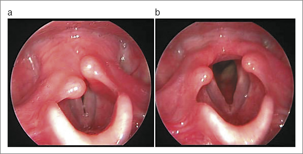 Рис. 6. Мальчик Д., 8 лет. Дисплазия слизистой оболочки черпаловидных хрящей: а – фонация; b – дыхание.