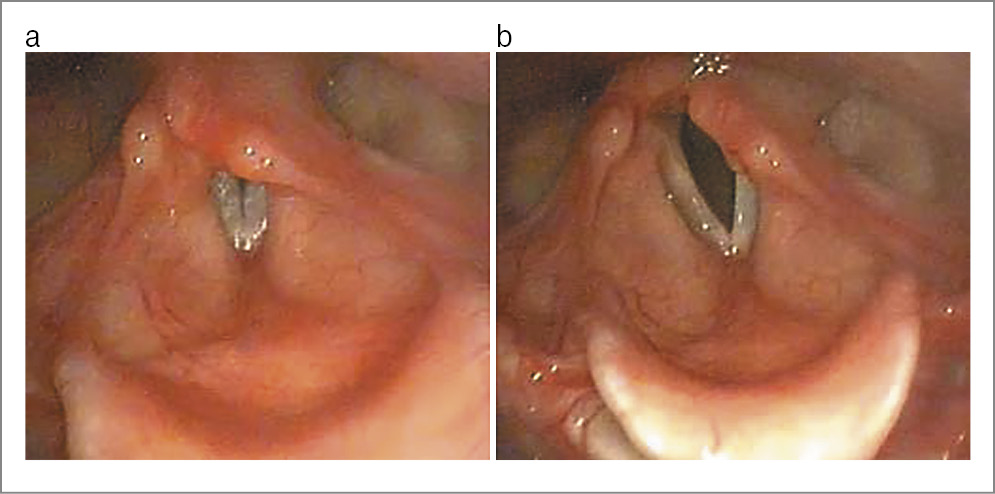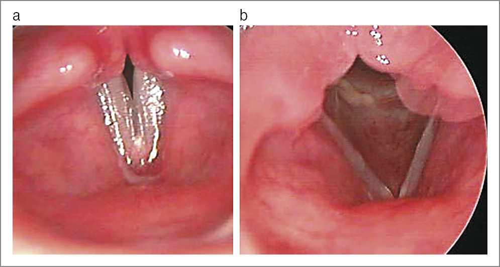 Рис. 9. Девочка О., 7 лет. Врожденный паралич гортани: а – фонация; b – дыхание.