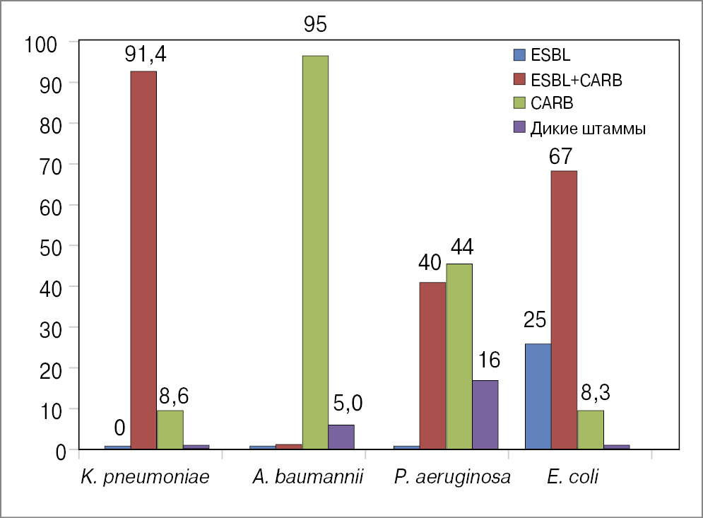 Результаты. Установлено, что в этиологической структуре возбудителей инфекции превалировали грамотрицательные микроорганизмы – 93%. Среди них преобладали: Klebsiella pneumoniae – 42%, Acinetobacter baumannii – 28%, Pseudomonas aeruginosa – 18%, Escherichia coli – 9%. Из них доля штаммов K. pneumoniae, продуцирующих β-лактамазы расширенного спектра и карбапенемазы, составила 91,4%. Уровень мультирезистентных бактерий и панрезистентных штаммов – 48,2 и 52% соответственно.