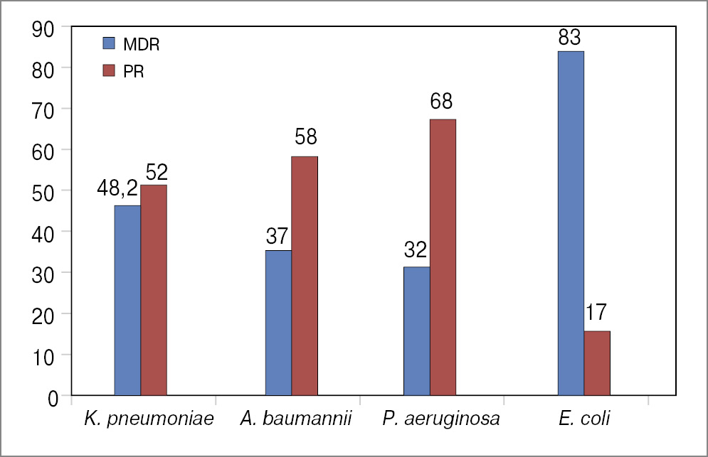 Из них доля штаммов K. pneumoniae, продуцирующих β-лактамазы расширенного спектра действия (β-лактамазы расширенного спектра действия отличаются способностью наряду с пенициллинами и ранними цефалоспоринами расщеплять цефалоспорины III–IV поколений и азтреонам) – ESBL и карбапенемазы (CARB), составила 91,4%, только CARB – 8,6%. Удельный вес антибиотикорезистентных изолятов среди грамотрицательных микроорганизмов представлен на рис. 1. Уровень мультирезистентных бактерий (MDR) и резистентных к применявшимся антибиотикам или панрезистентных (PR) составил 48,2 и 52% количества выделенных микроорганизмов соответственно. У A. baumannii продукция бактерий с CARB составила 95%, уровень MDR – 37%, PR – 58%. У P. aeruginosa доля бактерий с ESBL+CARB составила 40%, с CARB – 44%, уровень MDR – 32%, PR – 68%. У E. coli доля с ESBL составила – 25%, с ESBL+CARB – 67%, с CARB – 8,3%, уровень MDR – 83%, PR – 17%. Сравнительная характеристика MDR и PR представлена на рис. 2.