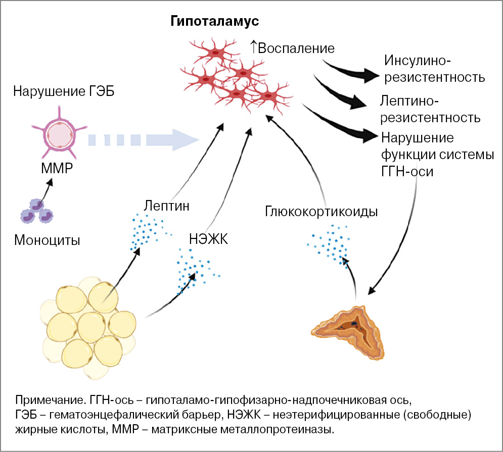 Соответственно, ожирение связано с хроническим низкоинтенсивным воспалением в ЖТ, которое постепенно приобретает системный характер, повышая риск развития различных патологических состояний, включающих стеатогепатит, ССЗ, нейродегенеративные заболевания. Поскольку хроническое воспаление на фоне ожирения тесно связано с метаболическими нарушениями, его называют «метавоспалением». В ходе воспалительного процесса происходит накопление макрофагов, преимущественно в висцеральном пуле ЖТ [29–32]. Большая часть этих макрофагов относится к фенотипу М1 (к «классически активированным»), обладающему провоспалительными свойствами. Макрофаги, ставшие активными в ЖТ, продуцируют воспалительные молекулы в большом количестве, что усиливает инсулинорезистентность и поддерживает воспалительный процесс, приобретающий системный характер.