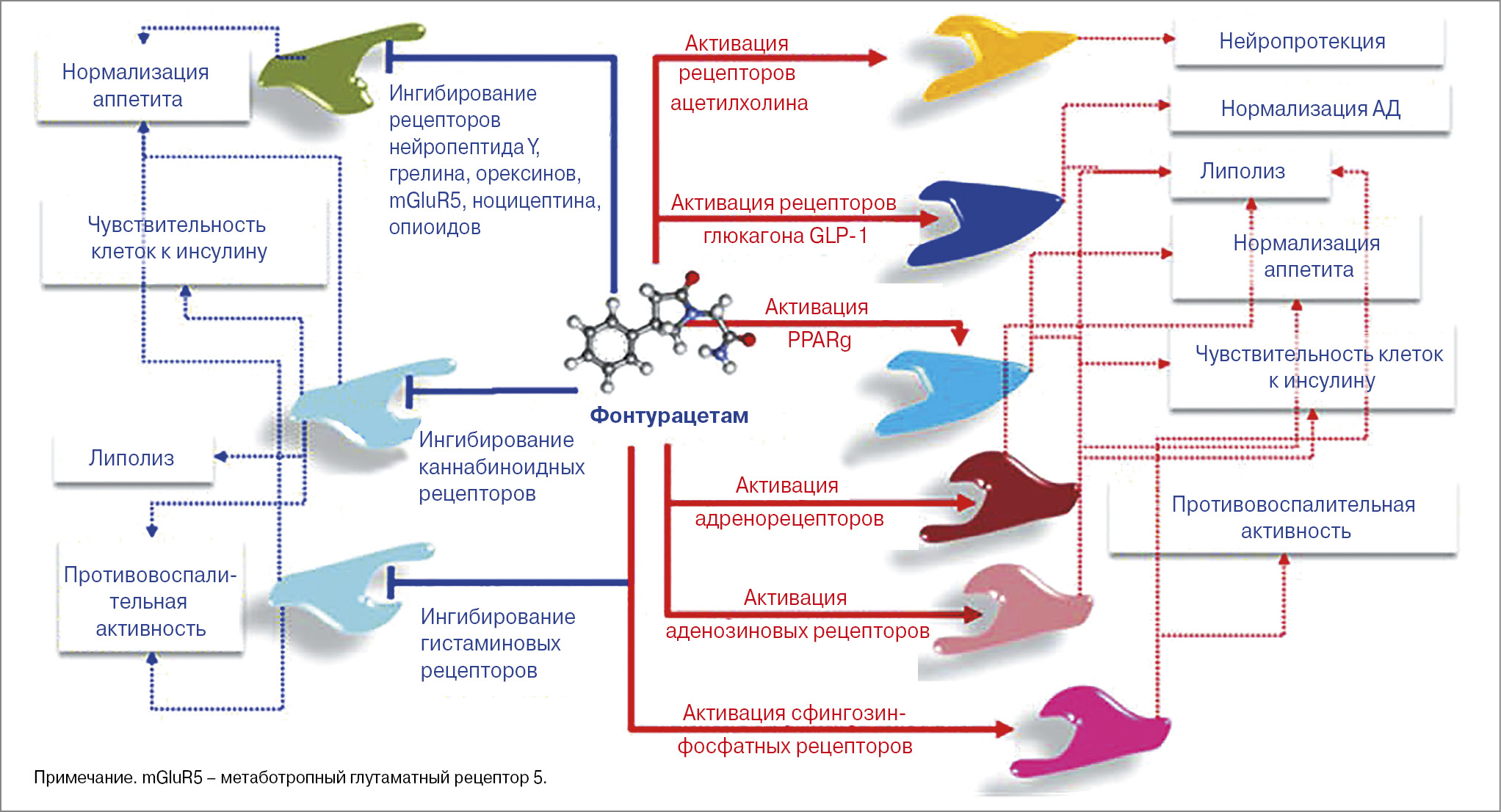 Поиск эффективных методов лечения ожирения остается актуальным, т.к. существующие стратегии терапии часто не приносят долгосрочных результатов или имеют серьезные побочные эффекты. Появление новых препаратов дает надежду на более эффективную терапию этого недуга, позволяя пациентам с ожирением достичь клинически значимого снижения МТ, снизить сердечно-сосудистые, метаболические риски и улучшить качество жизни. Фонтурацетам (Актитропил) – это лекарственный препарат, который уже доказал свою эффективность в лечении ряда заболеваний, связанных с различными нарушениями нервной системы. Тем не менее исследования указывают на то, что у данного лекарственного средства есть и потенциал для применения в борьбе с ожирением. Положительное воздействие фонтурацетама на контроль МТ, энергетический гомеостаз, углеводный и жировой обмен, анорексигенный, противовоспалительный эффекты являются ключевыми факторами, определяющими его перспективность для применения в комплексной терапии этого заболевания. Необходимы дальнейшие клинические исследования для оценки эффективности фонтурацетама у пациентов с ожирением в долгосрочной перспективе.