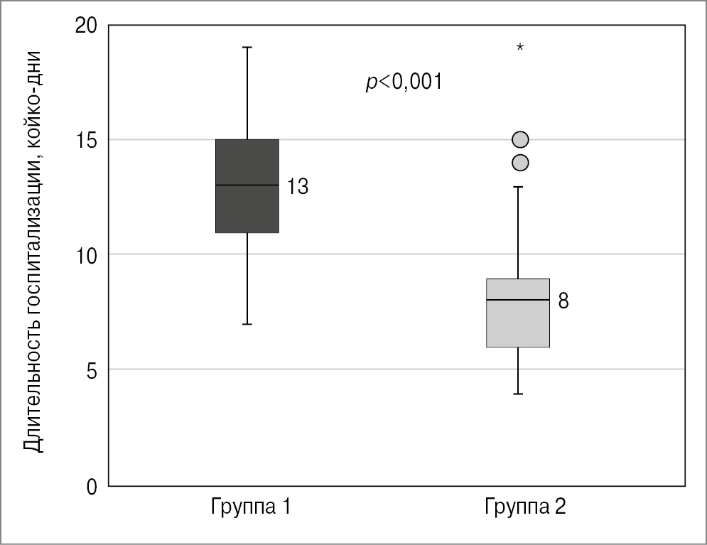 Пациенты группы 1 находились в стационаре значимо дольше пациентов группы 2: длительность госпитализации в среднем составила 13 (11–15) и 8 (6–9) койко-дней соответственно; p<0,001 (рис. 3).