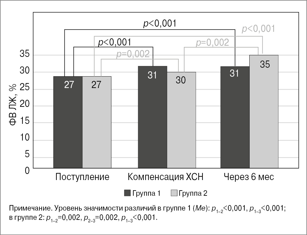 В обеих группах при оценке динамики ФВ ЛЖ отмечалось статистически значимое увеличение показателя (p<0,001 для обеих групп). Увеличение было существенным в 1-й половине периода наблюдения [в группе 1 с 27 (23–32) до 31 (25–35)%, в группе 2 с 27 (23–31) до 30 (27–35)%; p<0,001; p=0,002 соответственно] и при сравнении исходного и конечного показателей [в группе 1 с 27 (23–32) до 31 (26–35)%, в группе 2 с 27 (23–31) до 35 (30–42)%; p<0,001 для обеих групп]. В группе 2 отмечалось значимое увеличение показателя от момента выписки из стационара до конечной точки в 6 мес [с 30 (27–35) до 35 (30–42)%; p=0,002]; рис. 7.