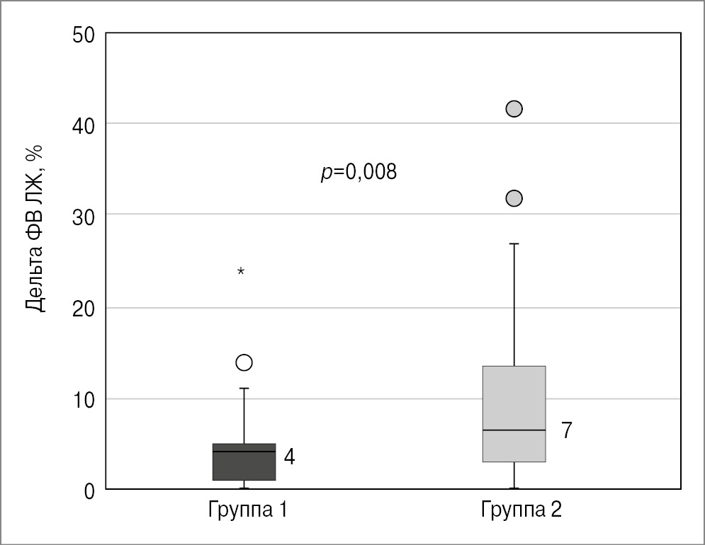 Дельта ФВ ЛЖ между поступлением в стационар и амбулаторным визитом через 6 мес также значимо отличалась и составила в группе 1 – 4 (1–5)%, в группе 2 – 6,5 (3–14)%; p=0,008 (рис. 9).