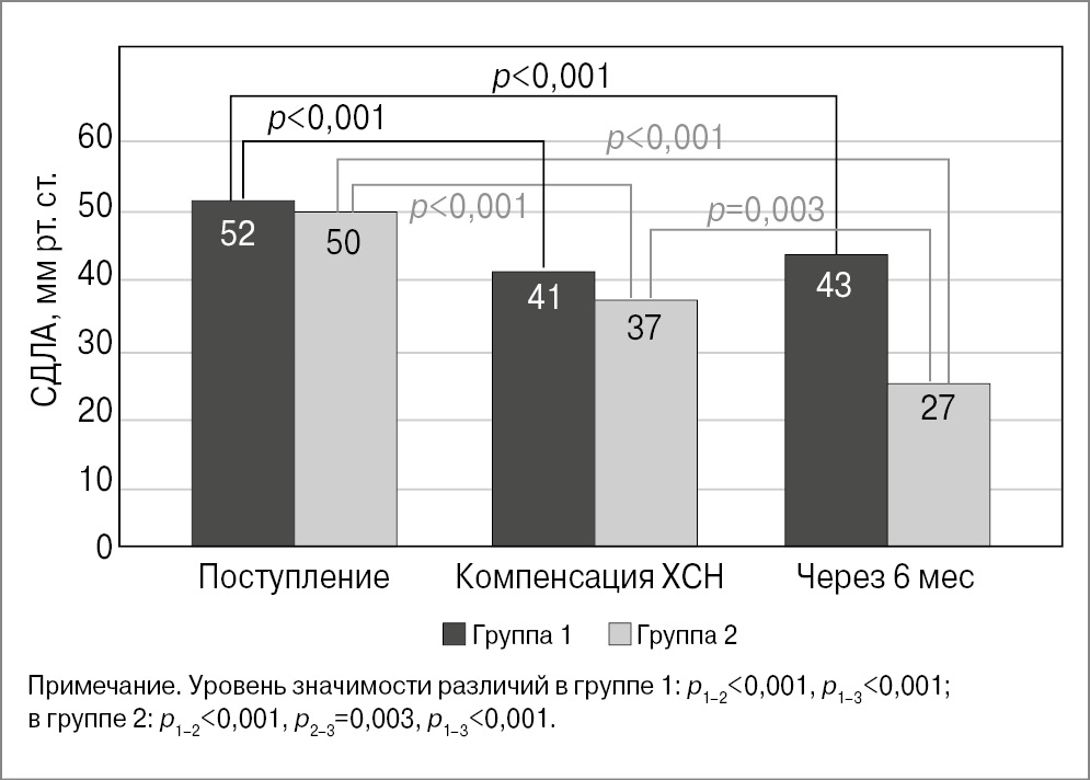 В обеих группах при оценке динамики систолического давления в легочной артерии (СДЛА) отмечалось статистически значимое изменение показателя (p<0,001 для обеих групп). Снижение было существенным в 1-й половине периода наблюдения [в группе 1 с 52 (43–61) до 41 (34–50) мм рт. ст., в группе 2 с 50 (42–60) до 37 (33–43) мм рт. ст.; p<0,001 для обеих групп] и при сравнении исходного и конечного показателей [в группе 1 с 52 (43–61) до 43 (39–50) мм рт. ст., в группе 2 с 50 (42–60) до 27 (21–35) мм рт. ст.; p<0,001 для обеих групп], а также от момента выписки из стационара до конечной точки через 6 мес [снижение в группе 2 с 37 (33–43) до 27 (21–35) мм рт. ст.; p=0,003] (рис. 10).