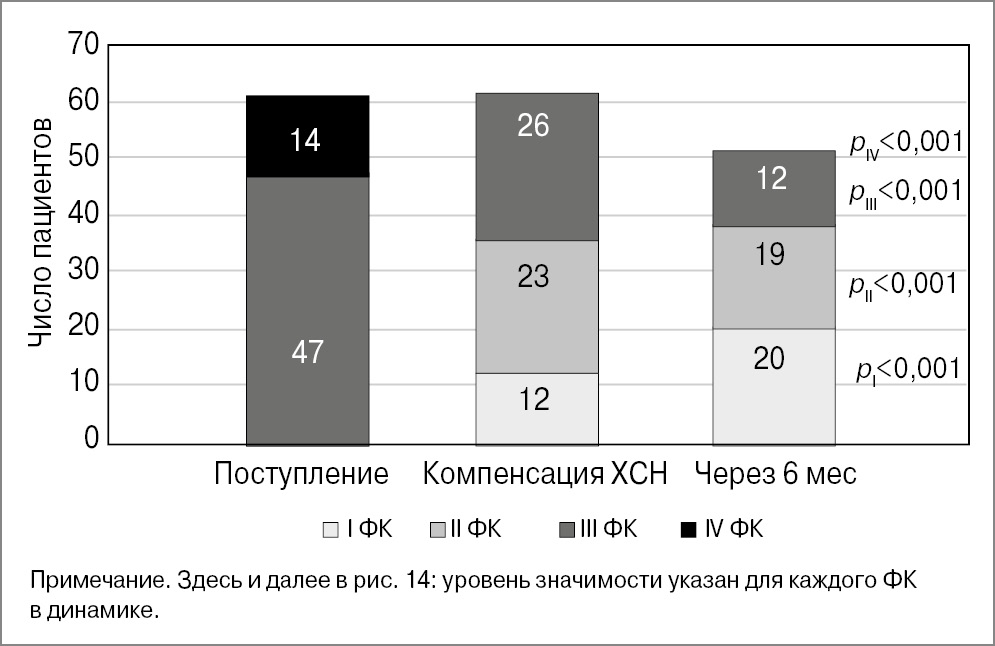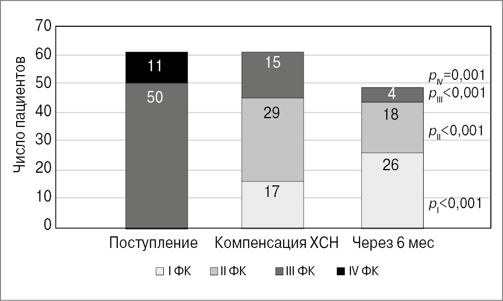 В группе 1 отмечались изменения каждого ФК в динамике от 1 до 3-й точки наблюдения. ФК I: на 1-й точке пациентов с I ФК не было, при выписке 12 (19,7%) пациентов соответствовали I ФК, через 6 мес наблюдения I ФК отмечался у 20 (39,2%) пациентов; pI<0,001. ФК II: 0 – 23 (37,7%) – 19 (37,3%) пациентов соответственно; pII<0,001. ФК III: 47 (77%) – 26 (42,6%) – 12 (23,5%) пациентов соответственно; pIII<0,001. ФК IV: 14 (23%) – 0 – 0 пациентов соответственно; pIV<0,001. Аналогичные изменения наблюдались в группе 2. ФК I: 0 – 17 – 26 пациентов; pI<0,001. ФК II: 0 – 29 – 18 пациентов; pII<0,001. ФК III: 50 – 15 – 4 пациента; pIII<0,001. ФК IV: 11 – 0 – 0 пациентов; pIV=0,001.