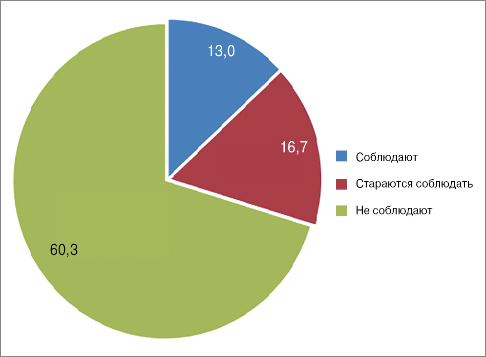 Помимо уратснижающих препаратов в лечении больных подагрой существенное значение имеет и низкопуриновая диета. В настоящее время пересматриваются подходы к ограничениям в питании таких пациентов в сторону их ослабления, однако в действующих клинических рекомендациях сохраняются указания на уменьшение в пищевом рационе богатых пуринами продуктов животного происхождения, алкоголя и фруктозосодержацих продуктов, прежде всего подслащенных напитков [3]. Все из опрошенных нами лиц знали о необходимости соблюдения диеты, большинство из них имели верное представление о том, употребление каких продуктов нужно снизить или исключить из рациона. Однако более 2/3 – 97 (70,3%) больных – заявили, что диету не соблюдают. Только 18 (13%), с их слов, соблюдают, и 23 (16,7%) стараются соблюдать необходимые ограничения в питании (рис. 1).
