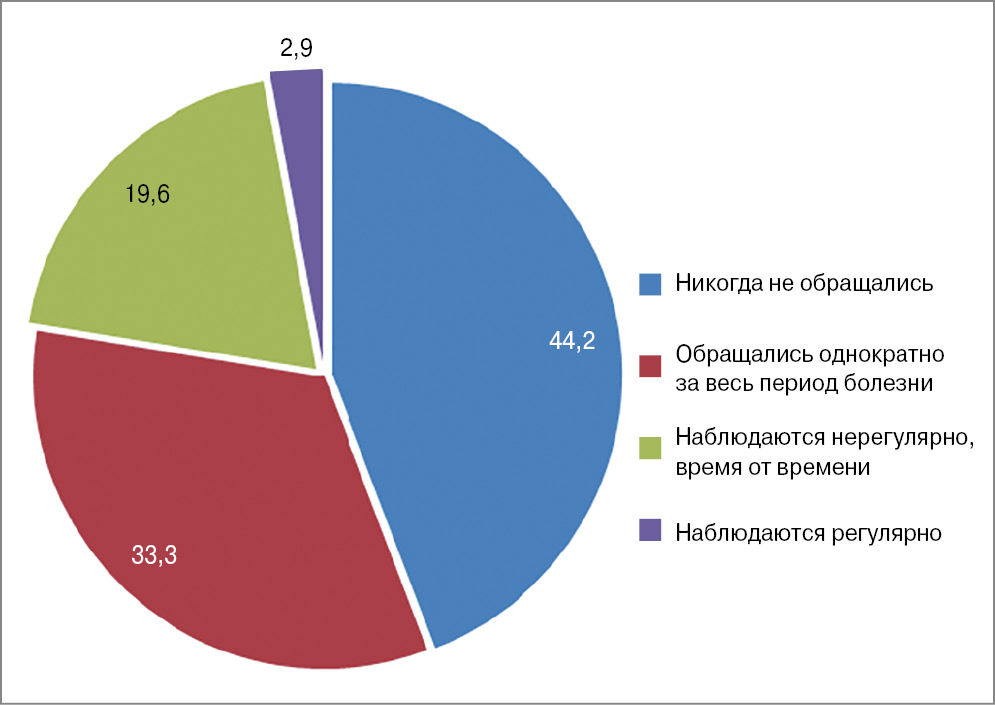 Наблюдение ревматолога для больных подагрой необходимо для текущей оценки состояния пациента, лучшего подбора терапии и в конечном итоге достижения целей лечения – снижения уровня МК до целевого и уменьшения количества приступов подагрического артрита. При этом большая часть опрошенных – 61 (44,2%) – никогда не обращались к ревматологу, подагра диагностирована врачами других специальностей: терапевтами, травматологами, хирургами. Сорок шесть (33,3%) из включенных больных обращались к ревматологу однократно за весь период болезни, контроль состояния не проводился. Приблизительно такое же число опрошенных больных – 27 (19,6%) – наблюдаются нерегулярно, время от времени, и только 4 (2,9%) из всей группы сообщили, что наблюдаются у ревматолога регулярно (рис. 2).