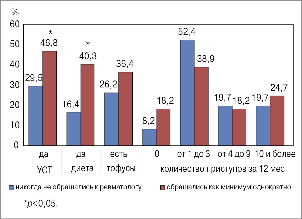 Мы разделили обследованных нами больных на 2 группы: 1-ю (n=61) составили пациенты, которые за время болезни никогда не обращались к ревматологу, во 2-ю (n=77) вошли те опрошенные, которые как минимум однократно осмотрены специалистом. Средняя длительность заболевания в 1-й группе составила 6,5±0,8 года, во 2-й группе – 10,2±0,9 года (p<0,05). Ожидаемо, пациентов, которые получали УСТ и соблюдали или старались соблюдать низкопуриновую диету, оказалось значимо больше во 2-й группе: УСТ – 18 (29,5%) и 36 (46,8%), диета – 10 (16,4%) и 31 (40,3%) соответственно (p<0,05); рис. 3.