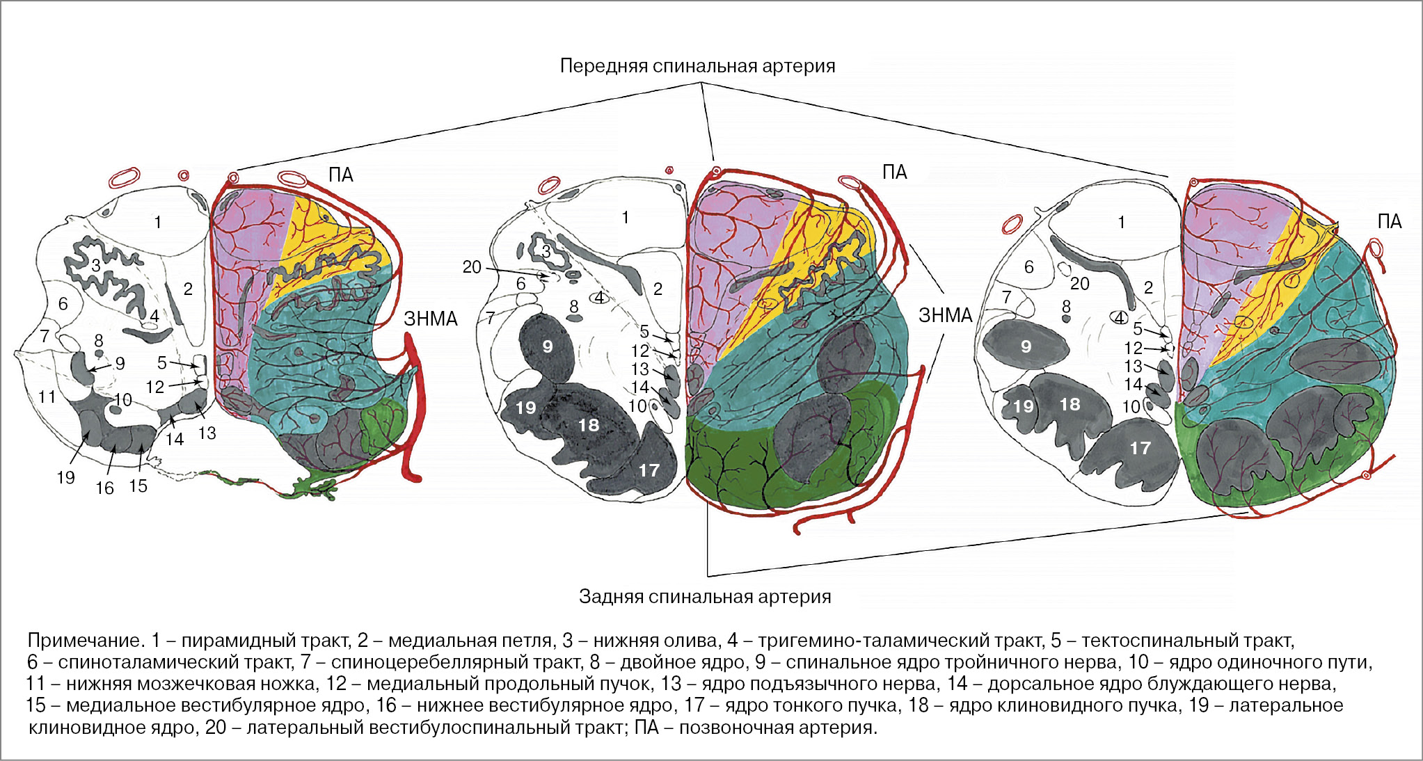 Рис. 1. Анатомия и кровоснабжение продолговатого мозга.