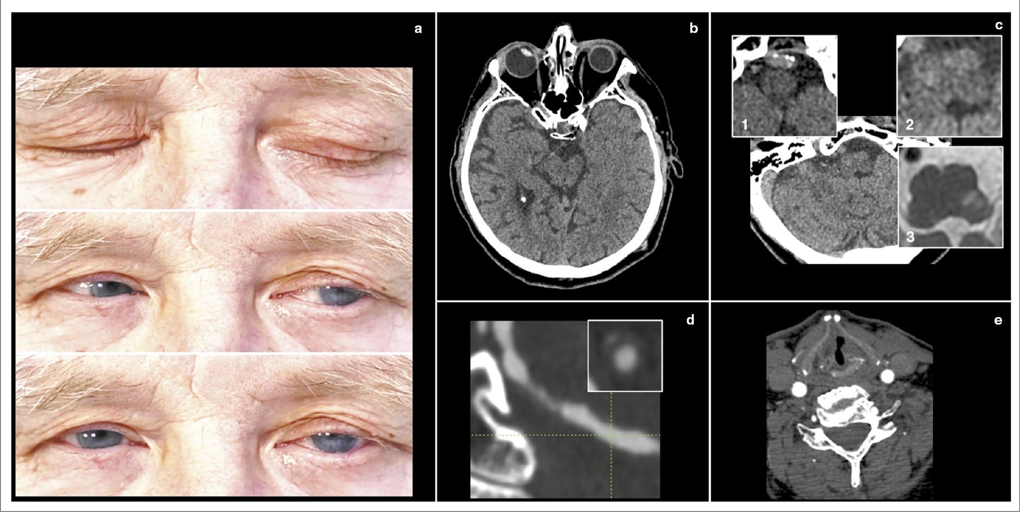 Рис. 3. Клинический пример типичного ЛМИ. Пациент 61 года. В 2021 г. перенес инфаркт миокарда, принимает клопидогрел. 25 февраля 2024 г. жена заметила, что у пациента невнятная речь, вскоре появились неустойчивость при ходьбе, тошнота и рвота. Поступил через 6 ч от начала заболевания с жалобами на головокружение. При поступлении выявлены синдром Горнера слева (a, нижнее изображение), горизонтально-торсионный нистагм, направленный вправо, положительный OLD-тест слева (a), легкая дизартрия и дисфагия, снижение болевой и температурной (в больше степени) чувствительности в правой половине тела, выраженная туловищная атаксия. Выполнена КТ головного мозга, визуализированы формирующаяся зона снижения плотности в латеральных отделах продолговатого мозга слева (c2), кальцификаты в проекции IV сегмента левой позвоночной артерии (c1), а также выраженная содружественная девиация глаз влево (b). При проведении КТА выявлен выраженный стеноз IV сегмента левой позвоночной артерии (d), а также медиальное смещение левой голосовой связки, свидетельствующее о ее парезе (e). На следующий день дисфагия прогрессировала до выраженной, установлен назогастральный зонд. Через 2 нед по данным бронхоскопии с оценкой глотания сохранялась дисфагия 1-й cтепени, парез верхней трети гортани и левой голосовой складки. Через месяц выполнена МРТ (Т2-взвешенное изображение) головного мозга, визуализирована зона кистозных изменений в латеральных отделах продолговатого мозга слева (c3).