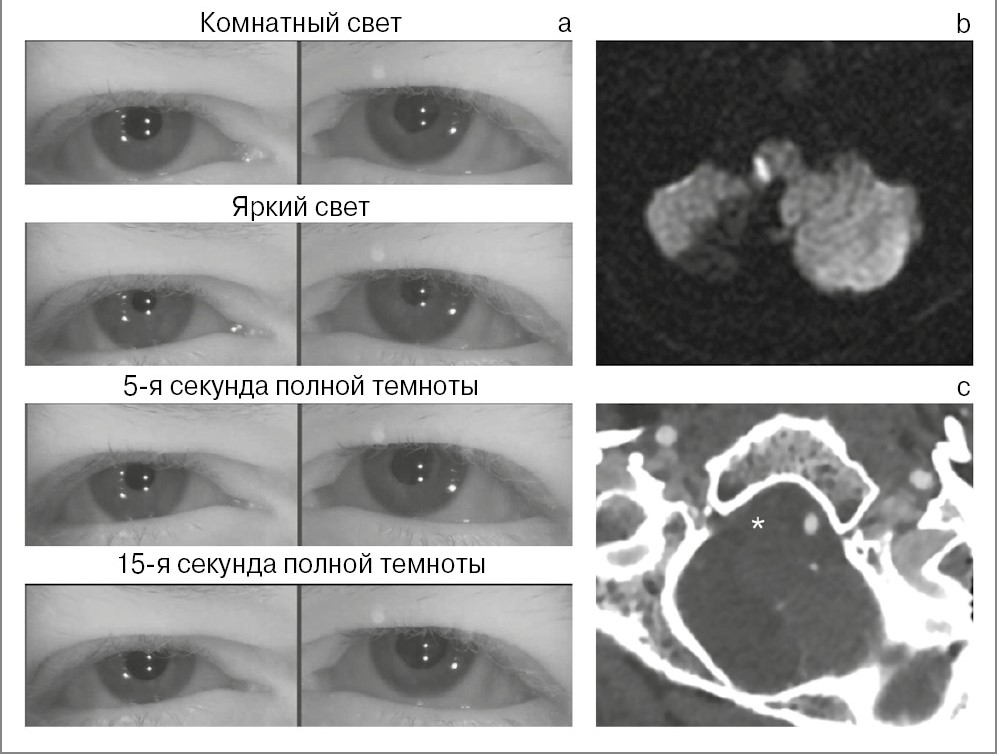 Рис. 4. Динамическая анизокория при синдроме Горнера у пациента с ЛМИ. При помощи видеоочков Френзеля продемонстрирован феномен задержки расширения зрачка при резком переходе из яркого света в полную темноту у пациента с ЛМИ (a, МРТ ДВИ) вследствие хронической окклюзии сегмента IV правой позвоночной артерии (c – КТА, окклюзия указана звездочкой).