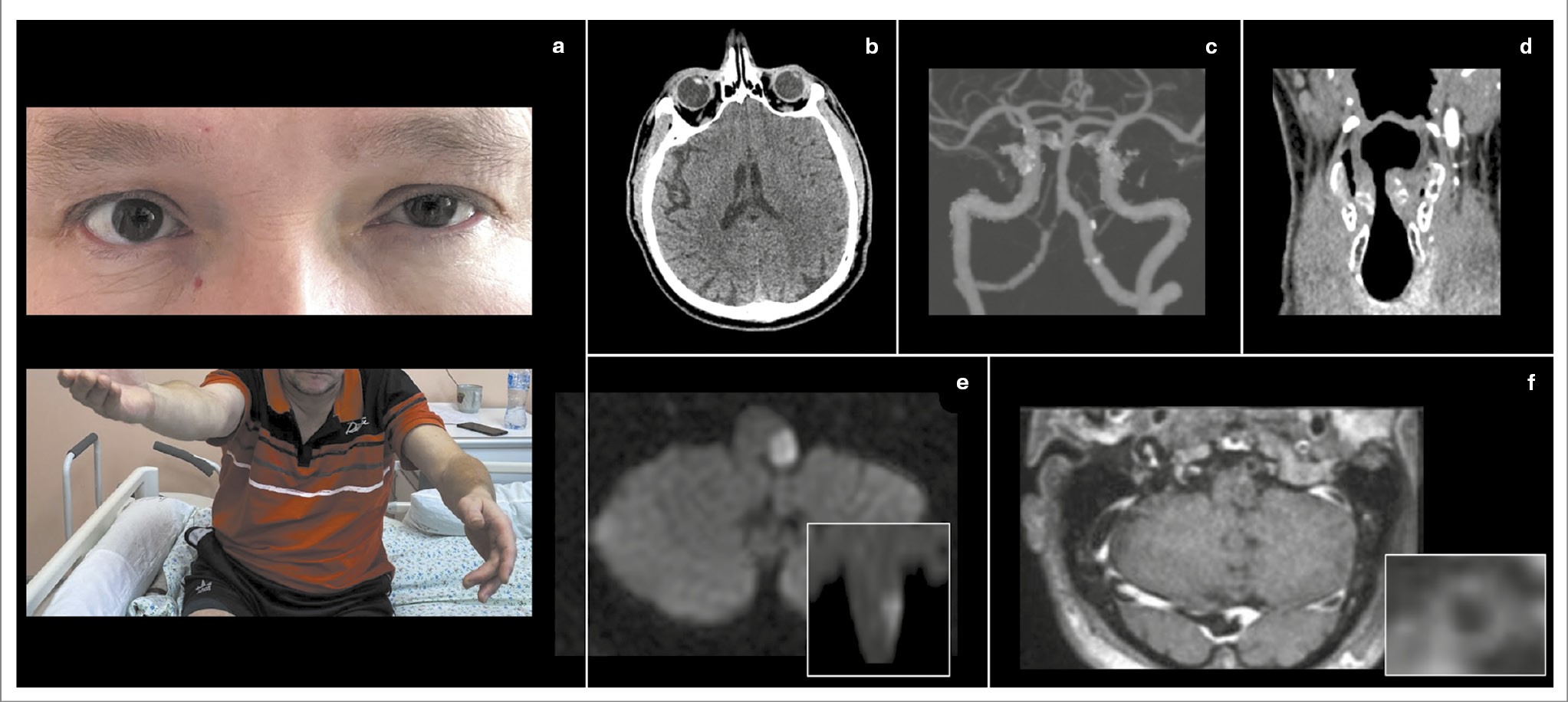 Рис. 5. Клинический пример синдрома Опальского. Пациент 51 года. Длительное время страдает артериальной гипертензией и сахарным диабетом 2-го типа, в 2018 г. перенес инфаркт миокарда. 2 декабря 2022 г. вечером почувствовал головокружение, шаткость при ходьбе. На следующий день появилась слабость в левой ноге. Поступил через сутки после возникновения первых симптомов. В неврологическом статусе при поступлении – интенсивный горизонтальный нистагм, направленный вправо, положительный OLD-тест слева, синдром Горнера слева (a, верхнее изображение), легкий левосторонний гемипарез (a, нижнее изображение), дизартрия и икота. Выполнена КТ головного мозга, визуализированы кальцификаты в проекции IV сегмента левой позвоночной артерии, а также выраженная содружественная девиация глаз влево (b). При проведении КТА выявлен выраженный стеноз IV сегмента правой позвоночной артерии (c), а также медиальное смещение левой голосовой связки, свидетельствующее о ее парезе (d). МРТ, выполненная на следующий день, позволила визуализировать инфаркт дорсолатеральных отделов продолговатого мозга слева, распространяющийся ниже перекреста пирамид (e). При введении контраста обнаружено его интенсивное концентрическое накопление стенкой IV сегмента левой позвоночной артерии, свидетельствующее о нестабильной субстенотической атероме (f).
