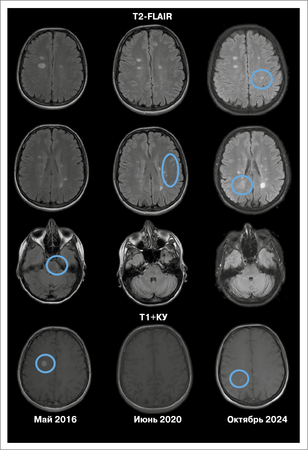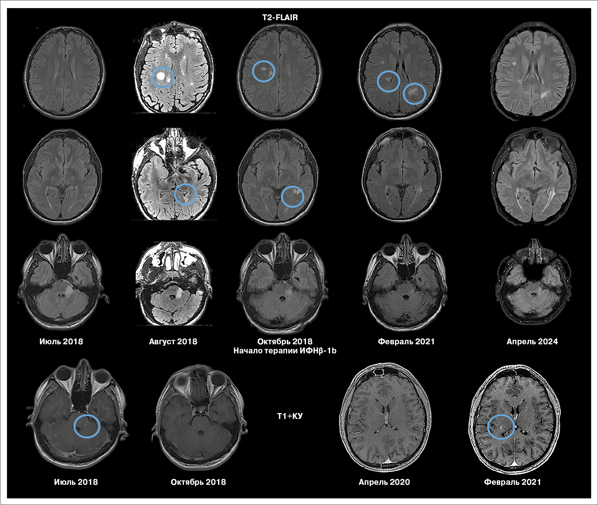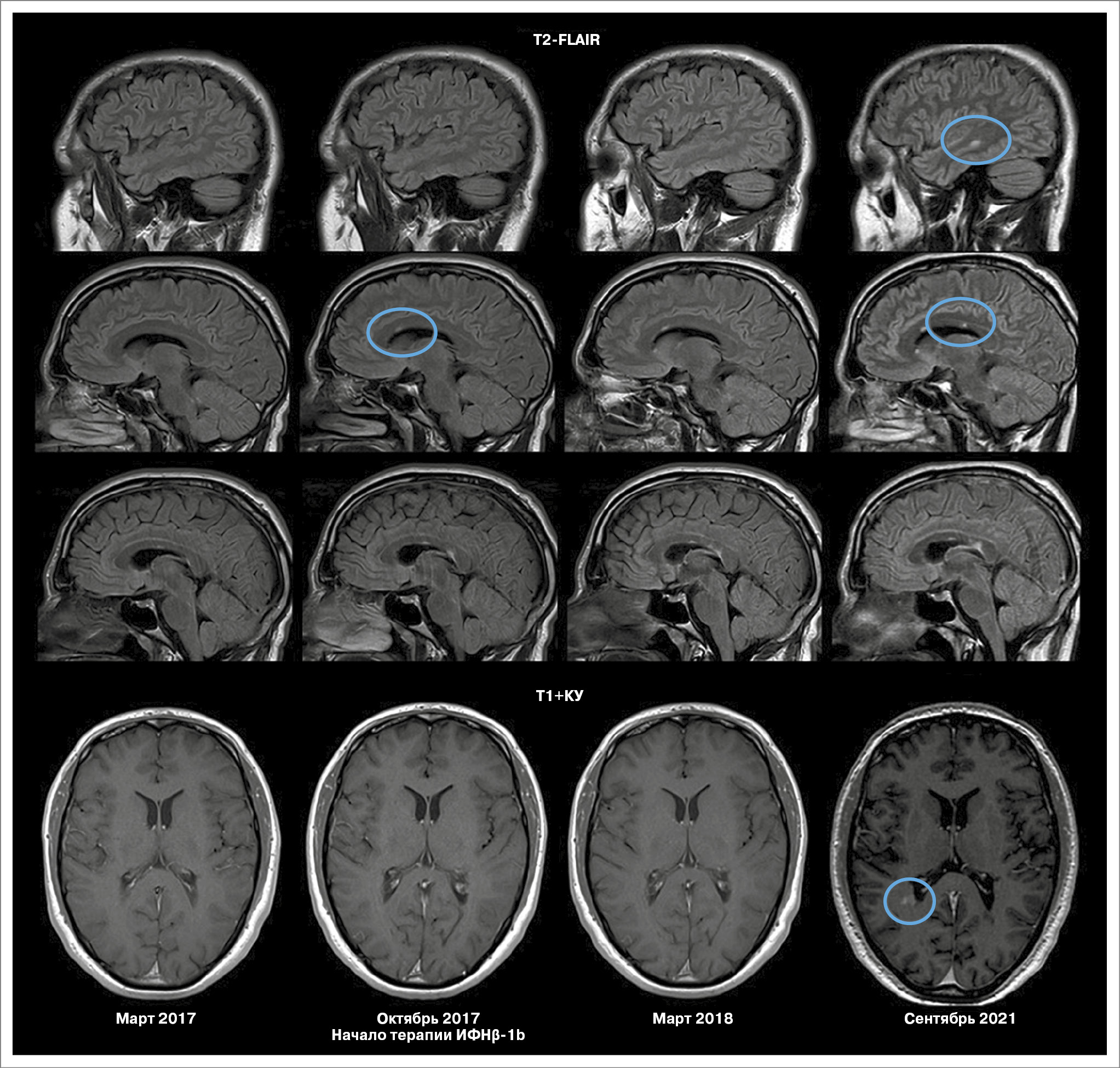 Рис. 3. МРТ пациентки М. на фоне терапии ИФНβ-1b с 2015 г. (клинический случай 3).