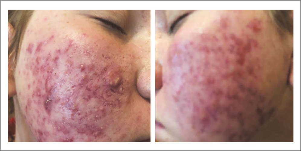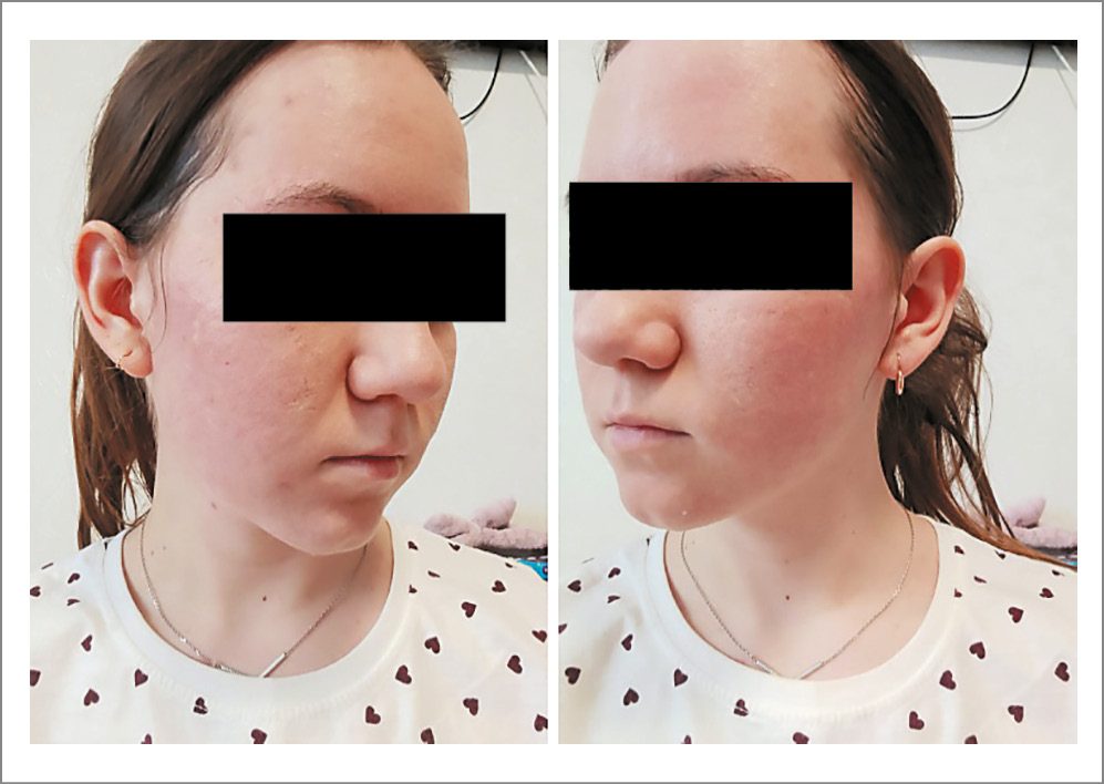 После завершения лечения, составившего в общей сложности 12 мес, получен положительный клинический результат, приведший к полной клинической регрессии акне (рис. 2). В настоящее время кожа лица, шеи, груди и спины чистая, с мелкими рубцовыми изменениями. Пациентка успешно учится в колледже, полностью социализирована, отсутствует психический, физический, функциональный и социальный дискомфорт. По истечении последующего года наблюдения готовится пройти курс лечения в косметологической клинике на предмет удаления рубцовой ткани.