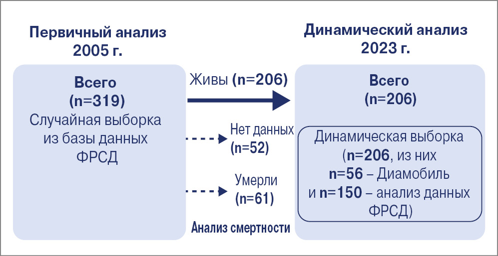 Сравнительный анализ данных динамической выборки в 2005 и 2023 гг. Динамическая выборка составила 206 уникальных пациентов с СД 1, обследованных в Диамобиле в 2005 г. и имевших статус «жив» на момент 2023 г., из них: 56 повторно обследованы непосредственно в Диамобиле в 2023 г.; данные 150 пациентов получены из региональной базы ФРСД.