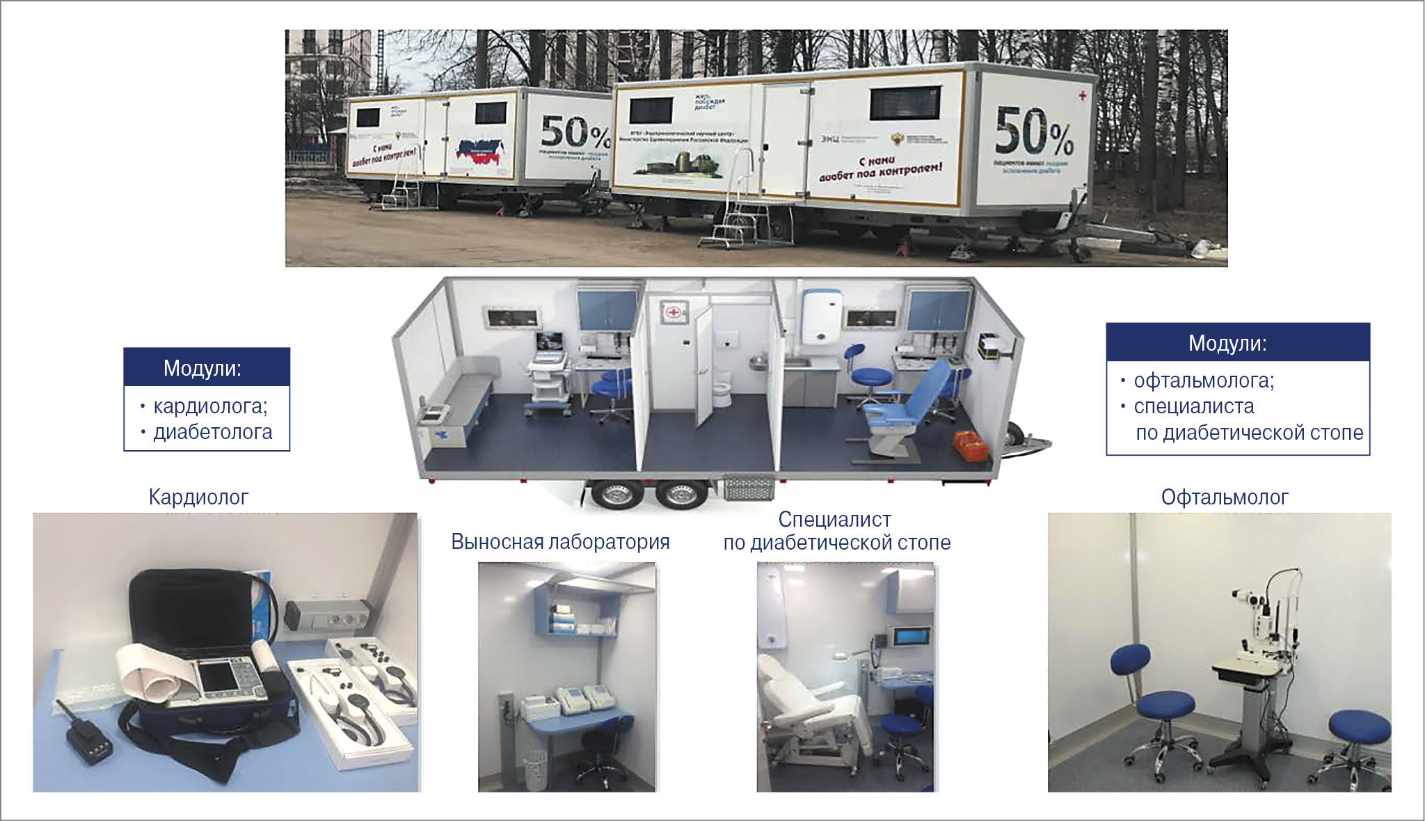 Методы. Общий объем исследований в Диамобиле соответствует стандарту обследования, направленного на оценку контроля углеводного обмена, состояния всех органов-мишеней при СД и раннюю диагностику диабетических осложнений согласно Алгоритмам специализированной медицинской помощи больным сахарным диабетом и клиническим рекомендациям [1, 13]. Диамобиль оснащен 4 специализированными кабинетами: кардиолога, диабетолога, офтальмолога, специалиста по диабетической стопе и выносной лабораторией (рис. 2).