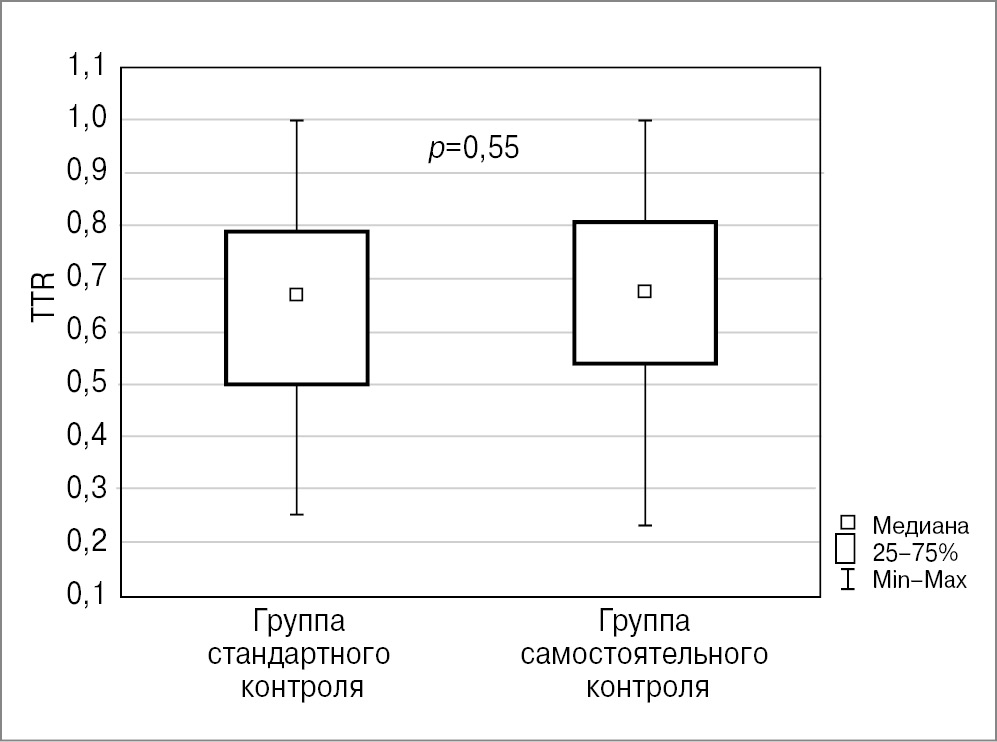 Рис. 2. Время нахождения значений МНО в терапевтическом диапазоне (TTR) в группах стандартного и самостоятельного контроля.