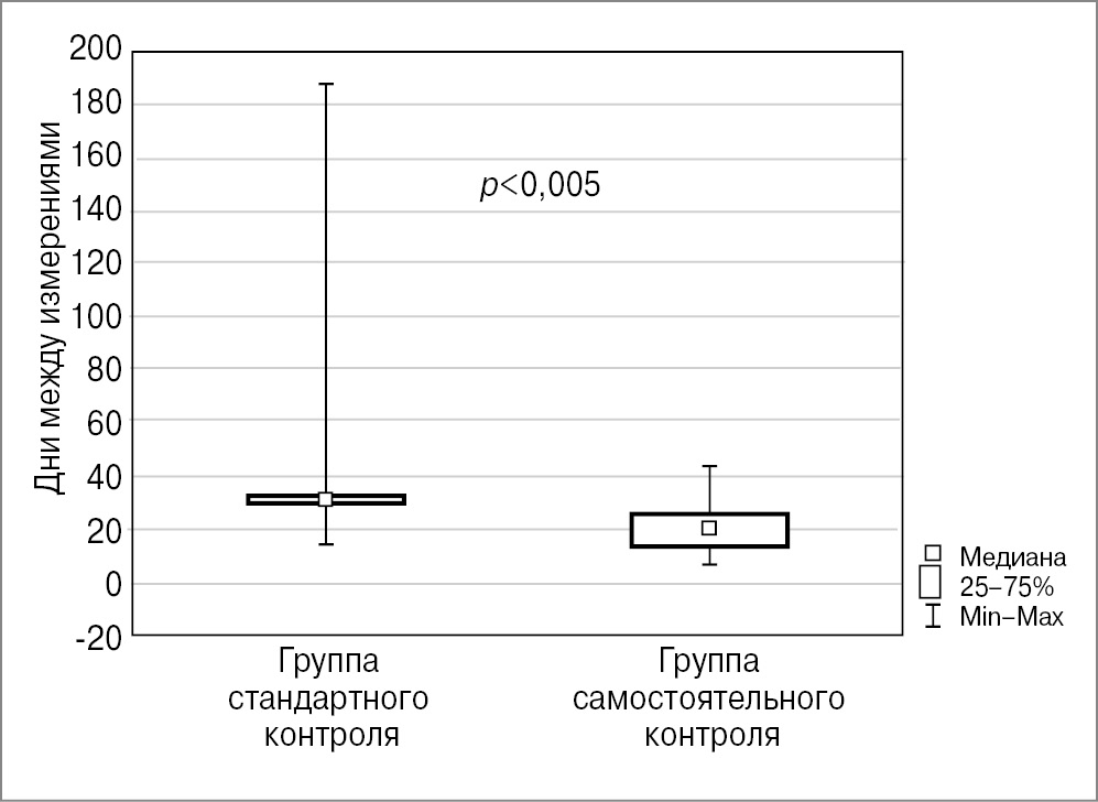Рис. 3. Интервалы между определениями МНО в группах стандартного и самостоятельного контроля.