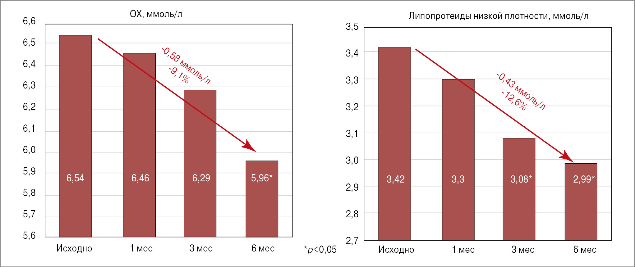 Рис. 1. Динамика ОХ и ХС липопротеидов низкой плотности у больных с умеренным риском на фоне монотерапии Мукофальком.