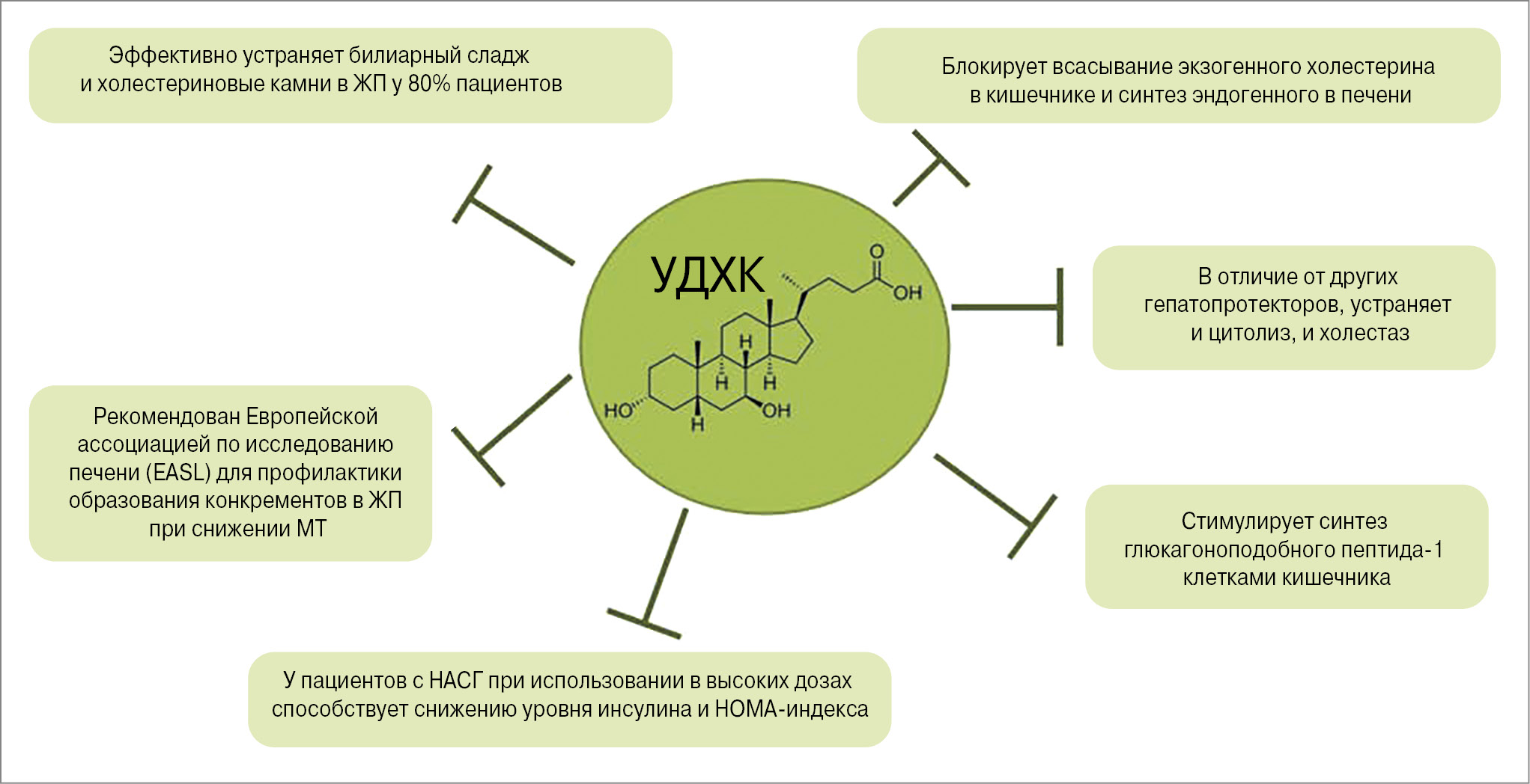 Положительное влияние УДХК на гликемические маркеры и контроль уровня глюкозы, чувствительность к инсулину представлено в метаанализе нескольких клинических исследований [32], в которых этот факт объясняется такими свойствами УДХК, как иммуномодуляция, ингибирование апоптоза, стимуляция секреции желчи, защита от цитотоксичности и окислительного стресса. Назначение УДХК целесообразно с целью не только уменьшения степени повреждения печени и регресса иммуновоспалительного компонента в рамках терапии НАЖБП, но и нормализации уровня липидов и глюкозы.