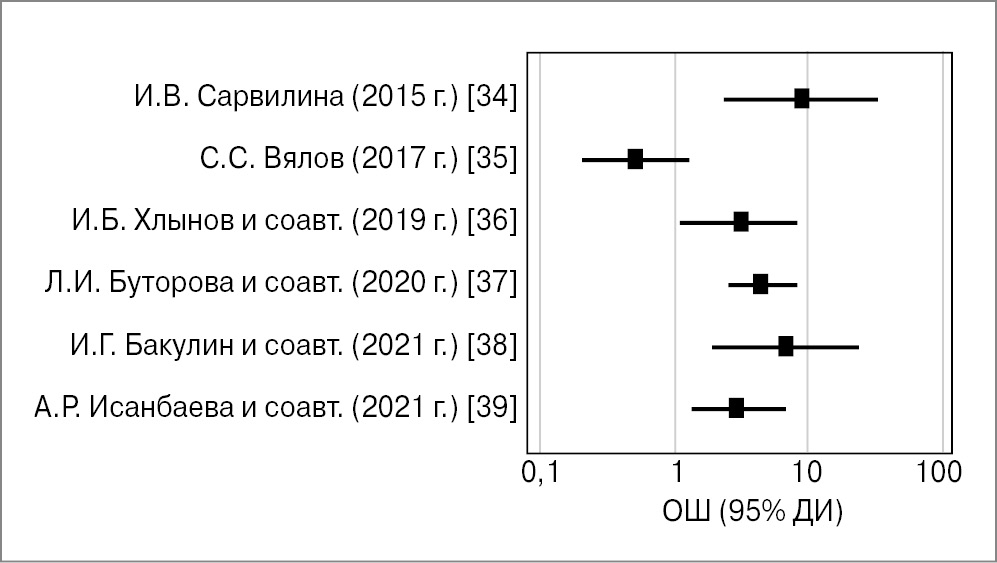Рис. 3. Форест-диаграмма, демонстрирующая ОШ и 95% ДИ эффективности Урсофалька в сравнении с другими препаратами УДХК в растворении билиарного сладжа (3 мес).