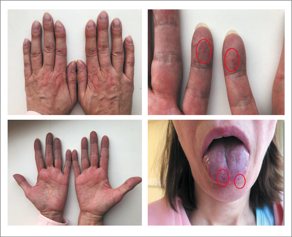 Рис. 1. Внешний вид пациентки: признаки выраженного акроцианоза, пальцы в виде «барабанных палочек» и ногти в виде «часовых стекол», телеангиэктазии на пальцах и языке.