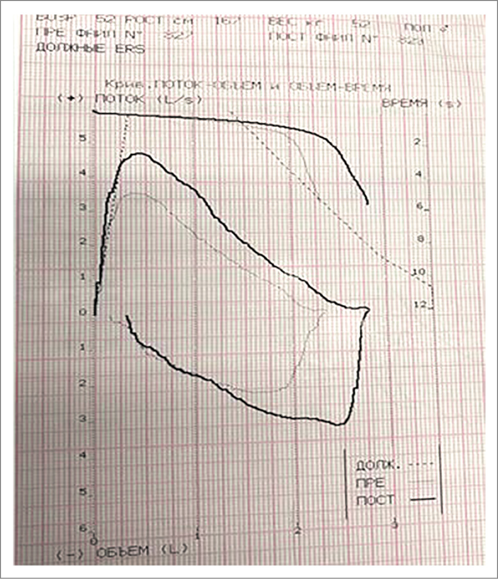 По данным лабораторных и инструментальных методов обследования в общем анализе крови выявлены: эритроциты – 5,2×109/л, гемоглобин – 163 г/л, гематокрит – 48%, другие показатели в норме. У пациентки вместо ожидаемого анемического синдрома обнаружено повышение уровня гемоглобина и гематокрита, что интерпретировано как следствие компенсаторной реакции организма на хроническую гипоксемию. В биохимическом анализе крови отмечены повышение уровня креатинина (109,9 мкмоль/л), снижение скорости клубочковой фильтрации (по формуле CKD-EPI 49,75 мл/мин/1,73 м2), а также повышение уровня общего билирубина (35,5 мкмоль/л) за счет непрямой фракции (32 мкмоль/л). D-димер (маркер тромбообразования) – 0,33 мкг/мл (норма – <0,5). Электрокардиография: без отклонений. По данным эхокардиографии (ЭхоКГ) камеры сердца не расширены, зоны нарушения локальной сократимости не выявлены, наблюдаются митральная (I–II стадия) и трикуспидальная (I–II стадия) регургитация, легочная регургитация (I стадия), признаки легочной гипертензии (ЛГ) – систолическое давление 40 мм рт. ст., фракция выброса левого желудочка – 67%, аорта не расширена, перикард без особенностей. Данные спирометрии представлены в табл. 1 и на рис. 2.