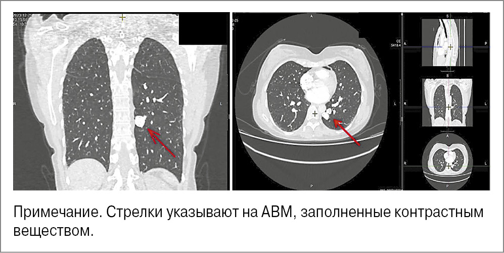 Суммируя полученные данные и отсутствие признаков обострения БА, решено, что причиной ДН является наличие сосудистых аномалий (крупных АВМ) в легких и шунтирования крови справа-налево. Для определения дальнейшей тактики пациентка проконсультирована у эндоваскулярного хирурга. Заключение: в связи с наличием АВМ в легких, являющихся причиной парадоксальных эмболий и, как следствие, ОНМК, показано эндоваскулярное лечение – окклюзия афферентов АВМ легочных артерий. 23 января 2024 г. проведена эмболизация 2 ветвей левой легочной артерии. Месяц спустя, при телефонном разговоре, клинически пациентка не отметила улучшения состояния, выраженность одышки оставалась прежней, а сатурация на атмосферном воздухе – без существенной положительной динамики.