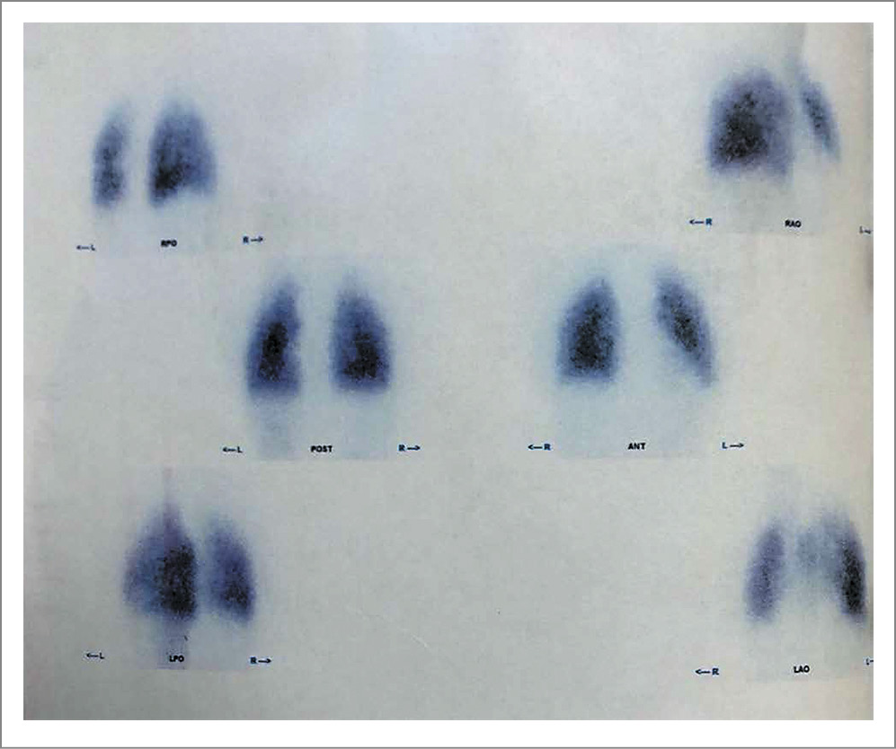 Принимая во внимание наличие дыхательной недостаточности (ДН) 2-й степени и подозрение на АВМ, для оценки перфузионной способности легких, верификации АВМ, их функциональных характеристик проведена однофотонная эмиссионная КТ (ОФЭКТ) легких (рис. 4). Заключение: сцинтиграфических данных за дефекты перфузии в легких в настоящее время не получено, признаков ТЭЛА нет. Сцинти-признаки ЛГ и шунта справа-налево.