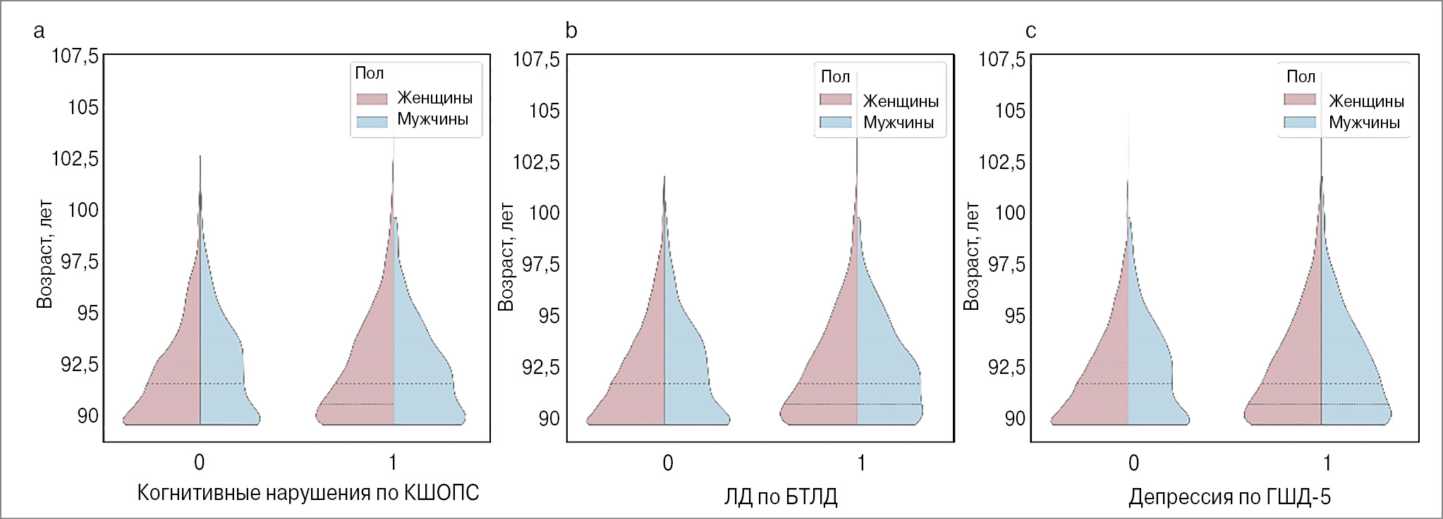 В исследование включены 3494 человека. Медиана возраста составила 92 [90, 94] года, 75,5% (2639) участников – женщины. Для оценки нейропсихического статуса использовались три шкалы: КШОПС, БТЛД и ГШД-5. Их медианные значения составили 24,00 [20, 00; 26, 00], 13,00 [9, 00; 15, 00] и 1,00 [0, 00; 3, 00] соответственно. Когнитивные нарушения, достигающие степени деменции по КШОПС, выявлены у 49% участников, ЛД по шкале отмечалась у 35% пациентов, симптомы депрессии по ГШД-5 – у 45% обследованных долгожителей.
