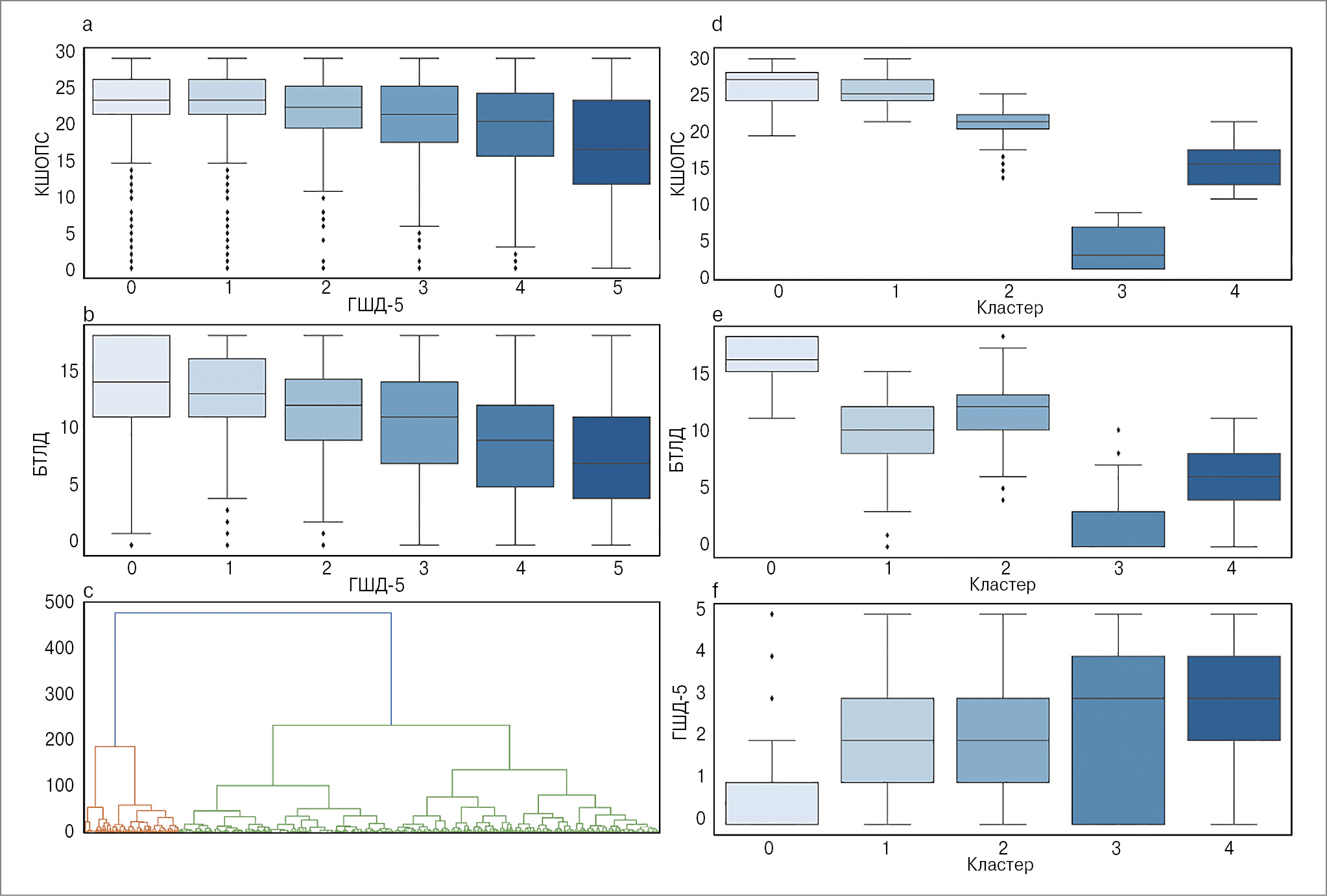 Рис. 2. Взаимосвязь между тремя шкалами для оценки когнитивного и психического статуса: a – взаимосвязь между шкалами КШОПС и ГШД-5; b – взаимосвязь между шкалами БТЛД и ГШД-5; c – иерархическая кластеризация участников исследования на основе результатов трех шкал; d – результаты тестирования по шкале КШОПС участников из разных кластеров; e – результаты тестирования по шкале БТЛД участников из разных кластеров; f – результаты тестирования по шкале ГШД-5 участников из разных кластеров.