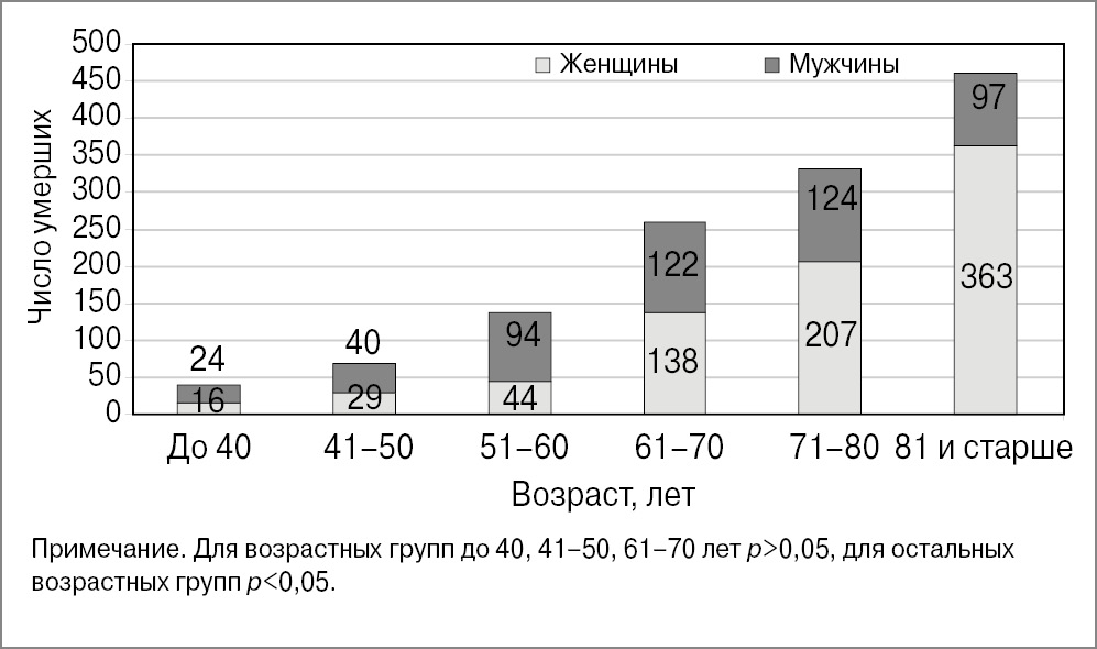 Среди умерших достоверно преобладали женщины – 797 (61,4%) человек, в то время как мужчины составили 501 (38,6%); р < 0,05 (табл. 3).