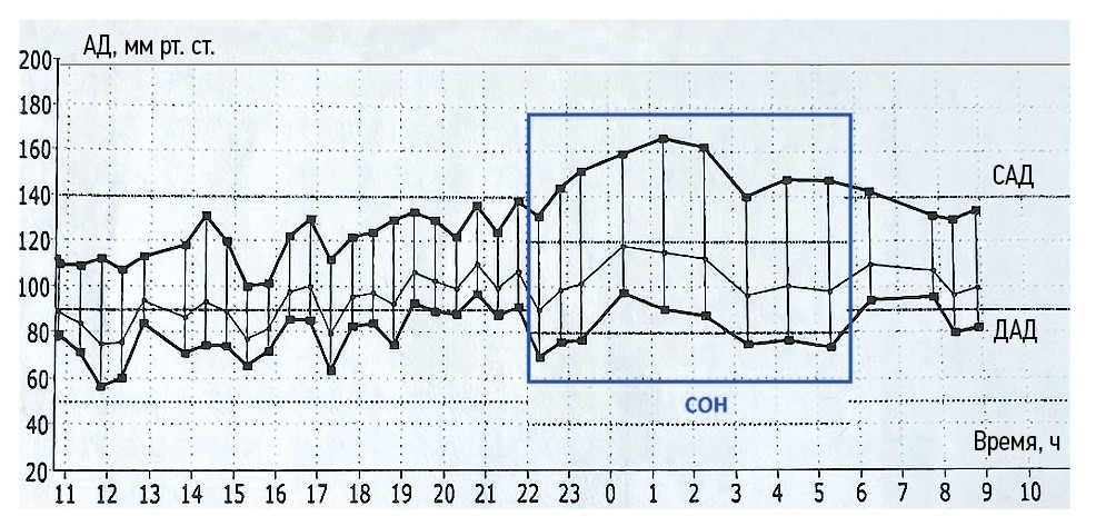 Сон изменяет активность вегетативной нервной системы и другие физиологические параметры, оказывающие влияние на регуляцию АД. В норме это проявляется снижением как систолического (САД), так и диастолического АД (ДАД) по сравнению с бодрствованием. Отсутствие или недостаточное снижение АД во время сна независимо повышает риск возникновения связанных с АГ сердечно-сосудистых заболеваний, а высокие ночные цифры АД даже в большей степени, чем дневные, предопределяют вероятность возникновения последующих сердечно-сосудистых катастроф [5].
